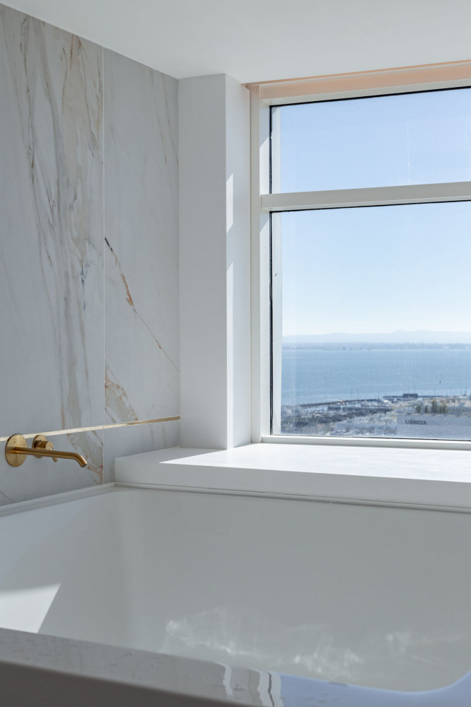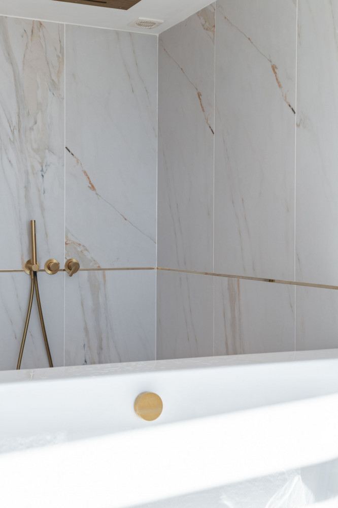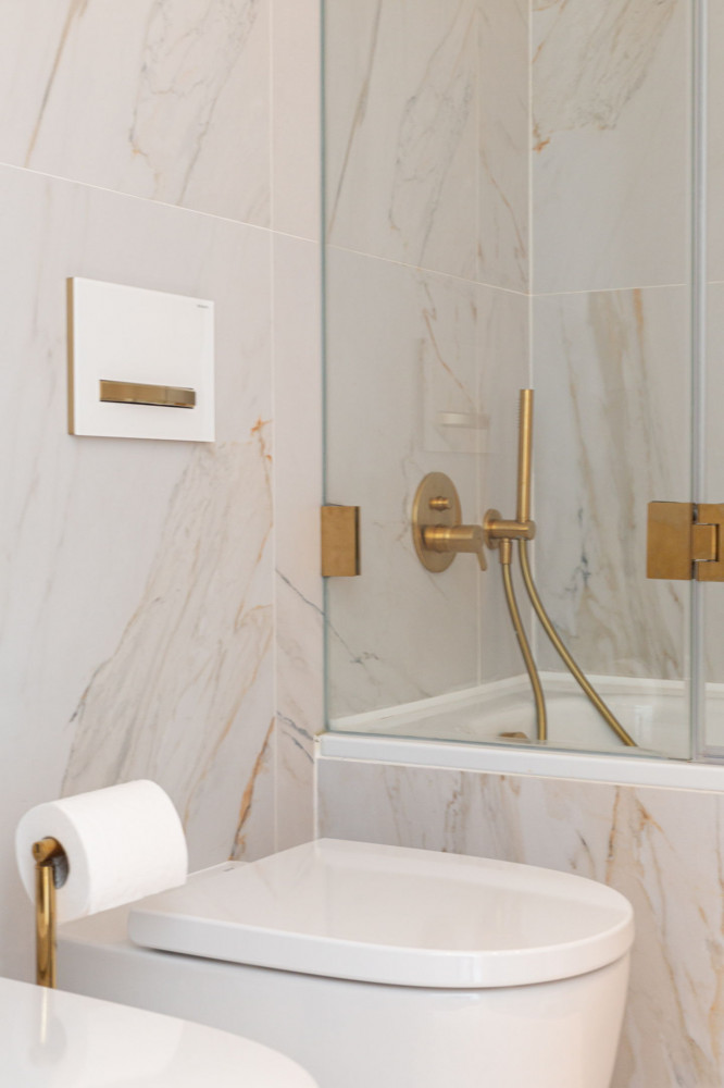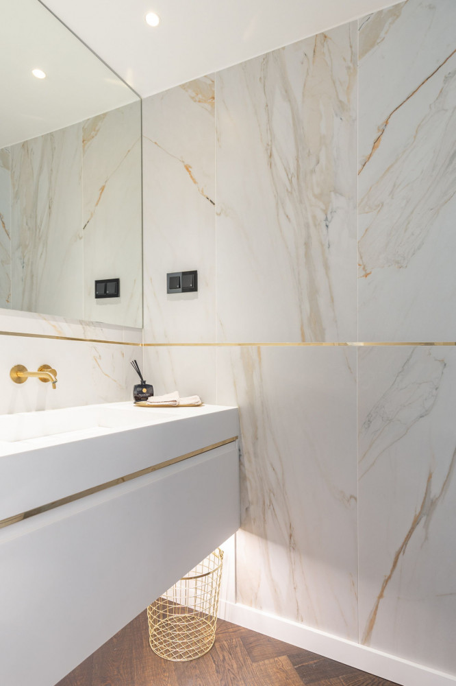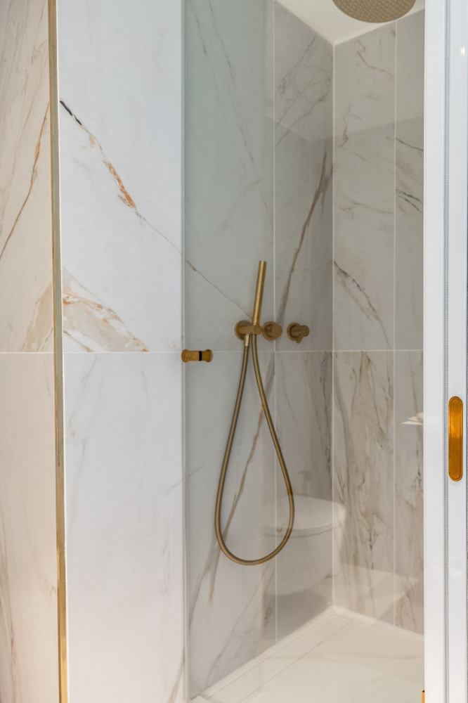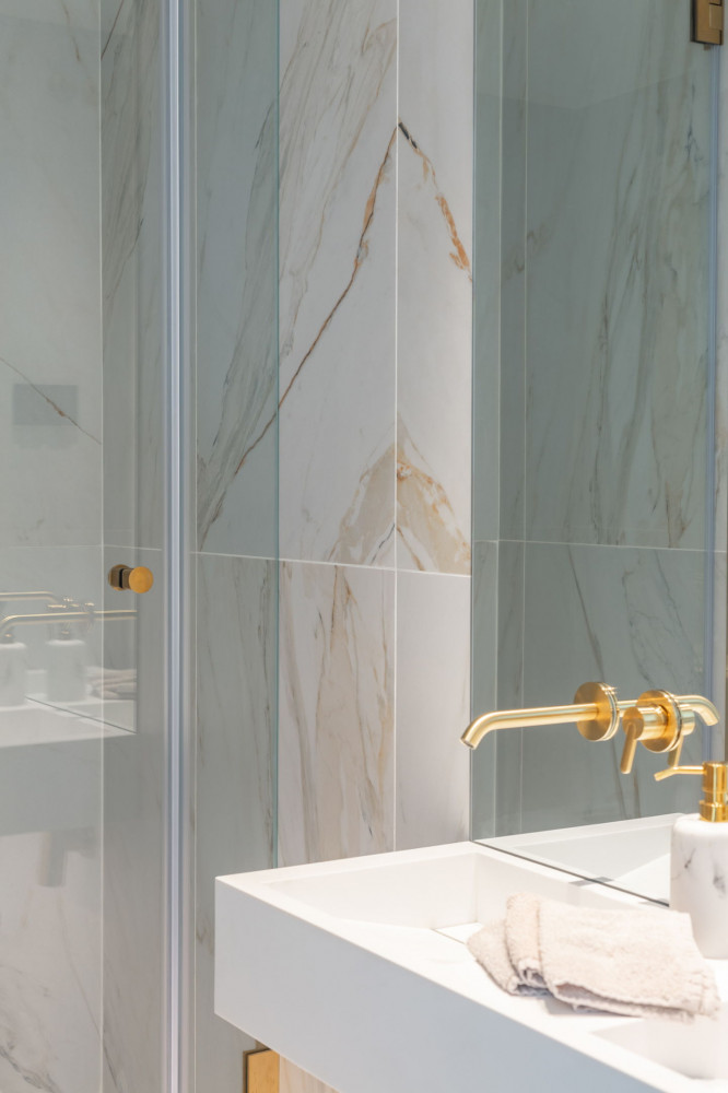 The bathrooms were conceived to evoke the atmosphere of a five-star hotel, with Calacata Gold Matte marble coverings from Revigrés and Corian Glacier White sinks. The details of excellence include Bruma Gold Sunrise PVD faucets, Roca suspended toilets, and Geberit systems, forming a set of absolute luxury.