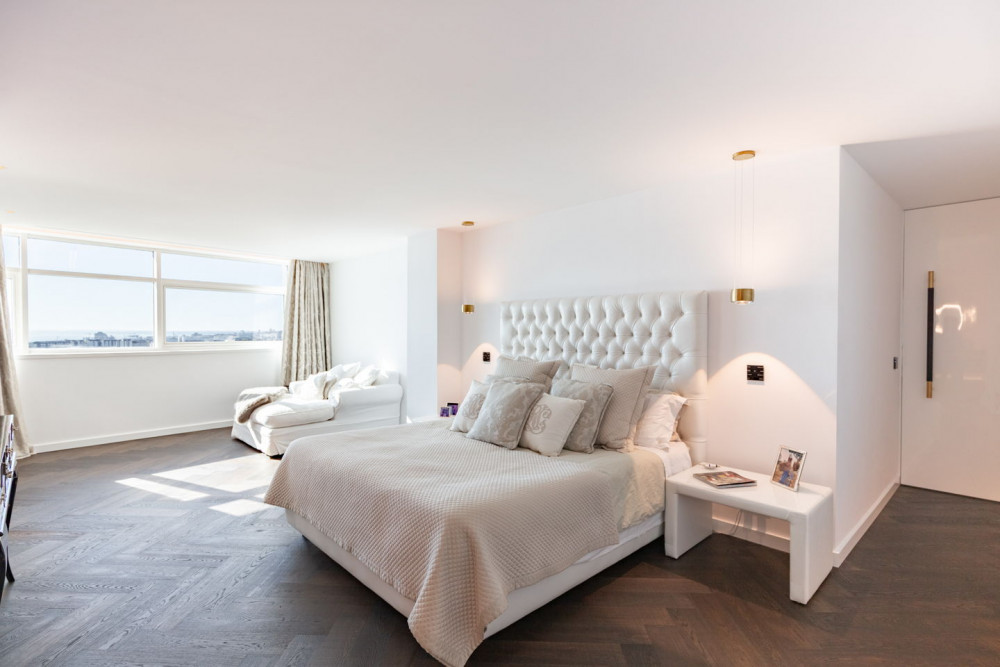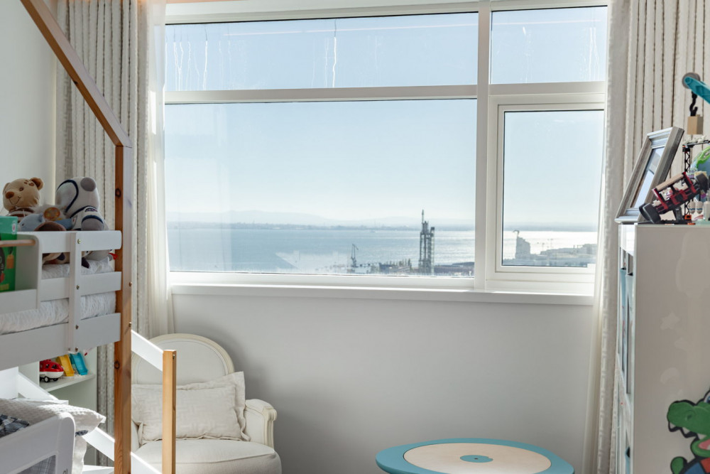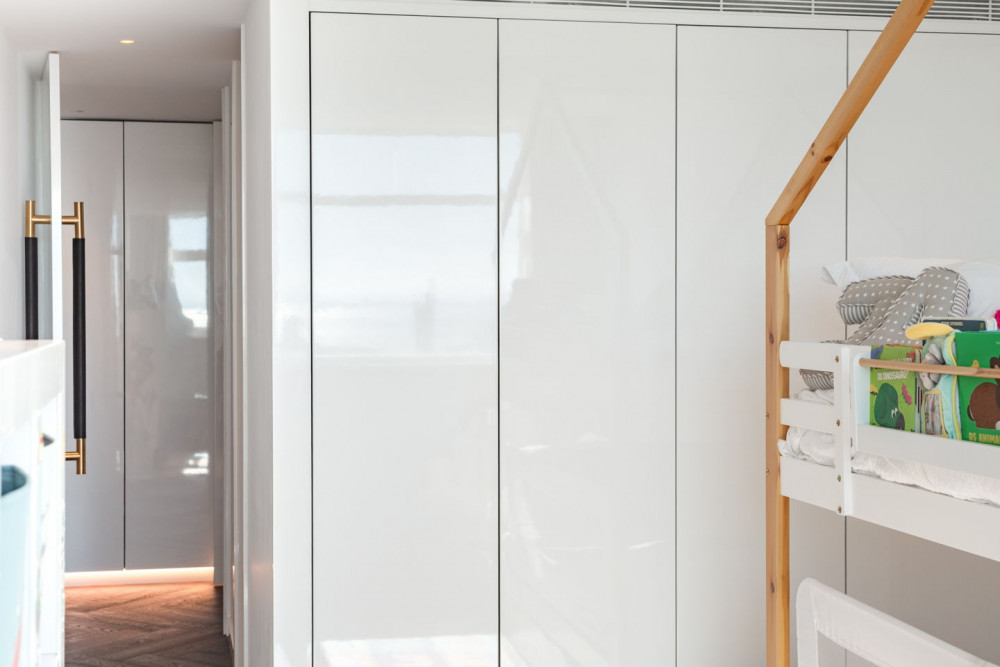 The interiors reveal a contemporary and tranquil elegance, marked by high-gloss white lacquered carpentry, pivoting doors up to the ceiling, and golden handles with genuine black leather. The custom-made built-in wardrobes reinforce the clean aesthetics and functionality of the space. The solid oak Real Dutch flooring, applied in a herringbone pattern and heated by electric underfloor heating, adds warmth, comfort, and an enveloping visual harmony to each room. To all this is added high-performance thermal and acoustic insulation and an electrical power of 27.6 kW, the highest in Torre São Gabriel, ensuring a perfect and silent environment.