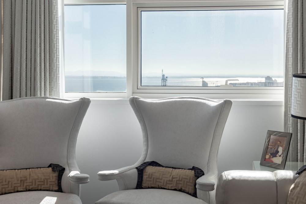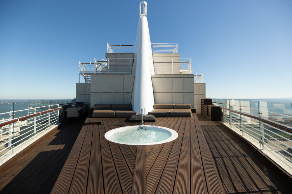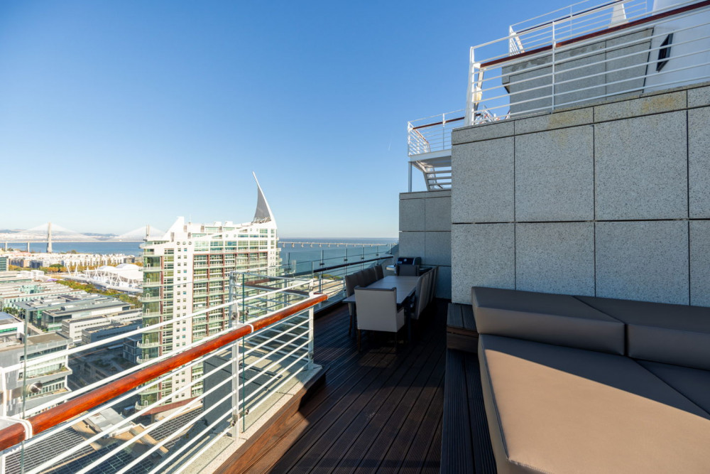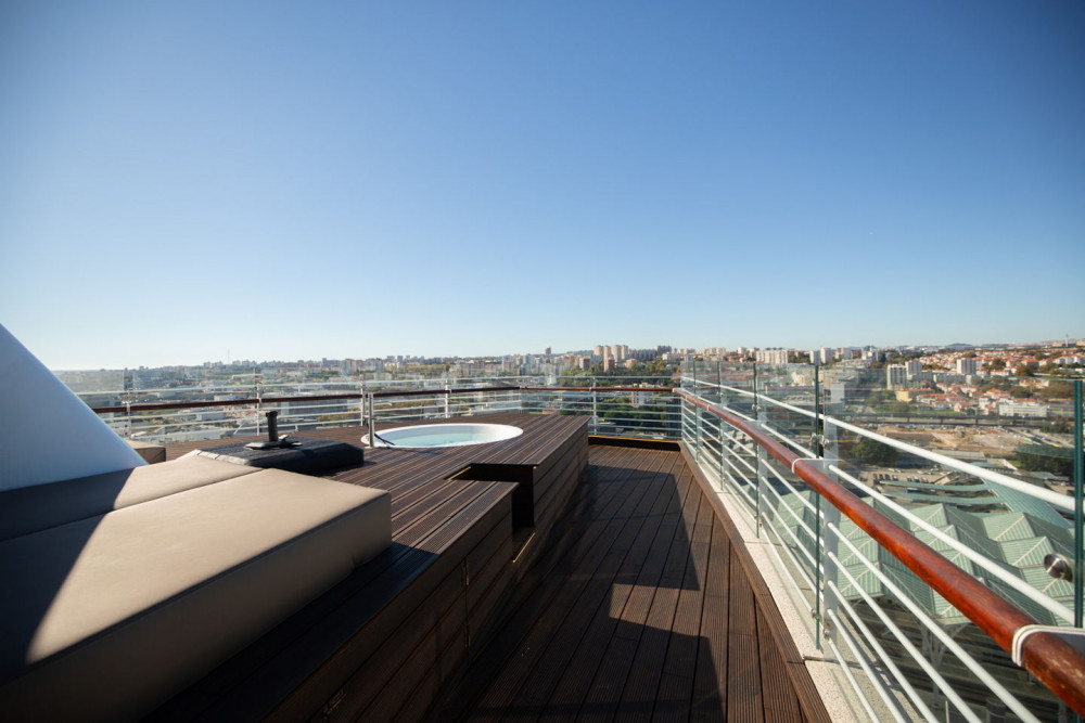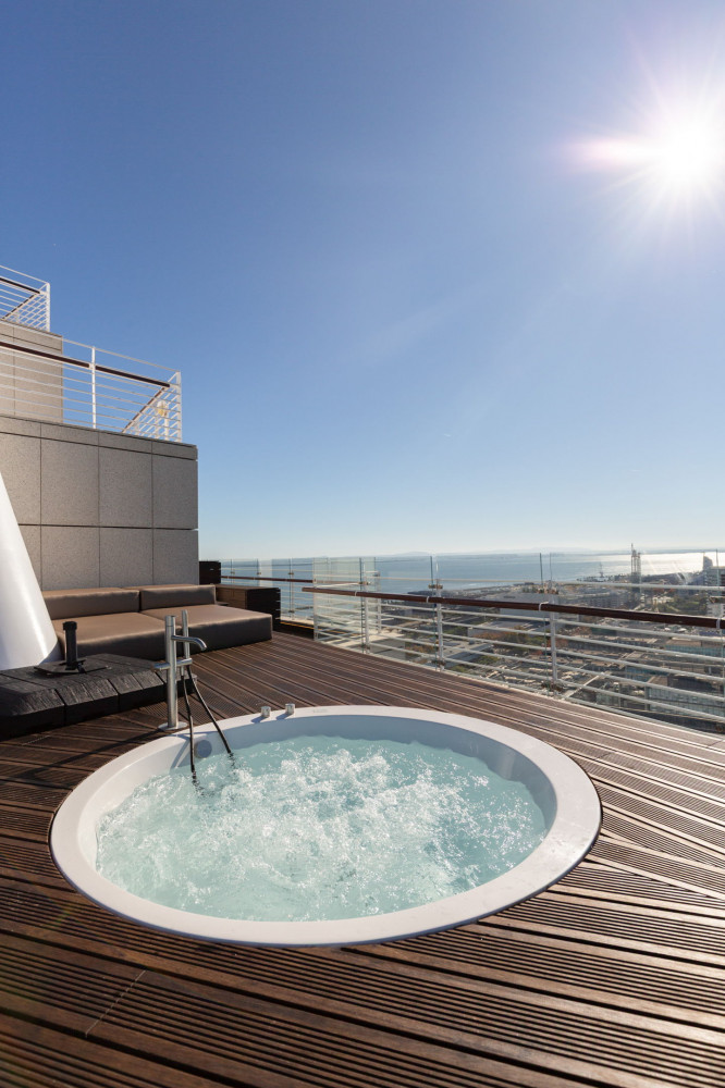 The 120 m² terrace is an authentic urban oasis, designed for leisure and contemplation. Equipped with an embedded Porcelanosa jacuzzi, double shower, dining area for twelve people, barbecue, and vertical garden, it offers unique moments of relaxation. Surrounded by 50 meters of laminated and tempered glass, with perimeter indirect lighting, the space provides an incomparable visual and sensory experience, suspended between the sky and the Tagus.