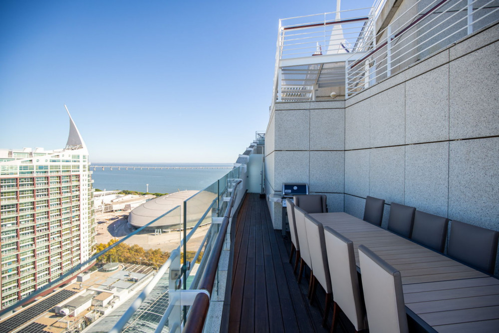 Designed by a renowned architecture firm, the lighting combines Mood PRO technology and Trace Line Gold & White, creating scenarios of extreme refinement and intimacy. When night falls, the terrace transforms into a true stage of elegance: the indirect light under the glass, combined with the Trevo bamboo wood deck, creates a space truly designed for complete leisure, with a fantastic view of the Tagus River and the lights of Lisbon.