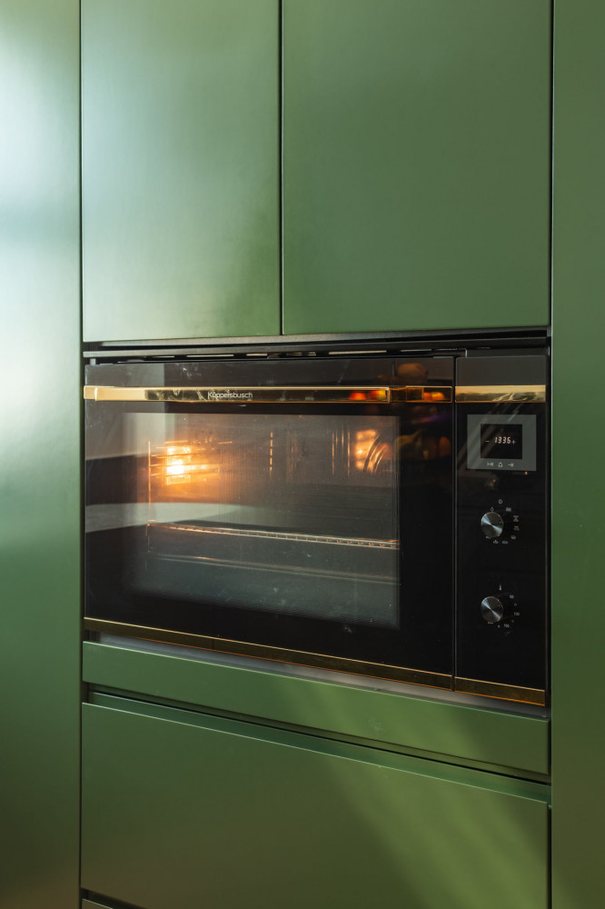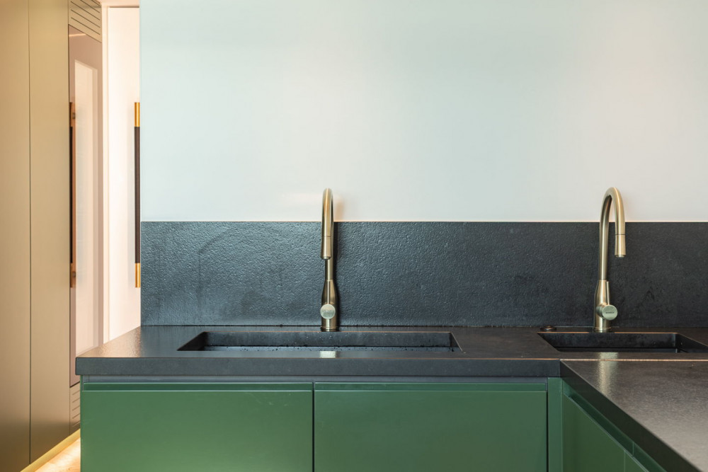 The kitchen presents itself as a true design piece, equipped with Küppersbusch and Miele appliances, brushed Zimbabwe granite countertops, and a distinctive black and gold American LG refrigerator. The laundry follows the same refined aesthetic and high-level functionality standard.