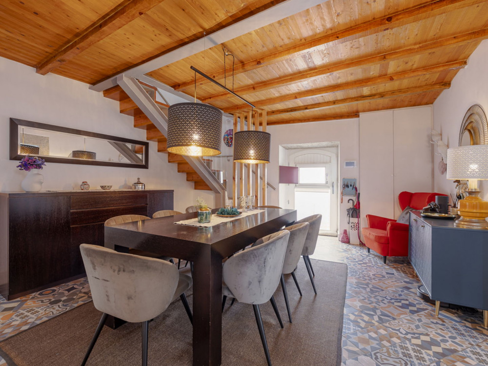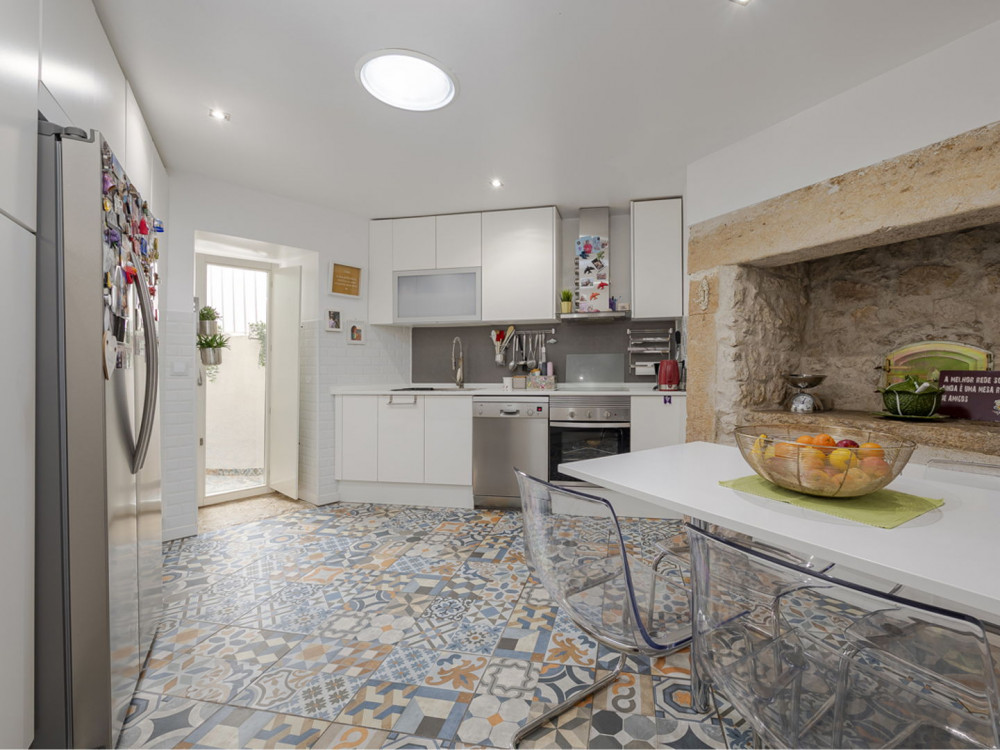 The house is a T4 with a total area of 322 square meters, situated on a generous plot of 510m2, benefiting from excellent solar exposure. The main access is through a preserved ancient gate, leading to an internal courtyard. This courtyard not only allows for the parking of two vehicles but also provides access to the main house and an annex with a bedroom and a bathroom.