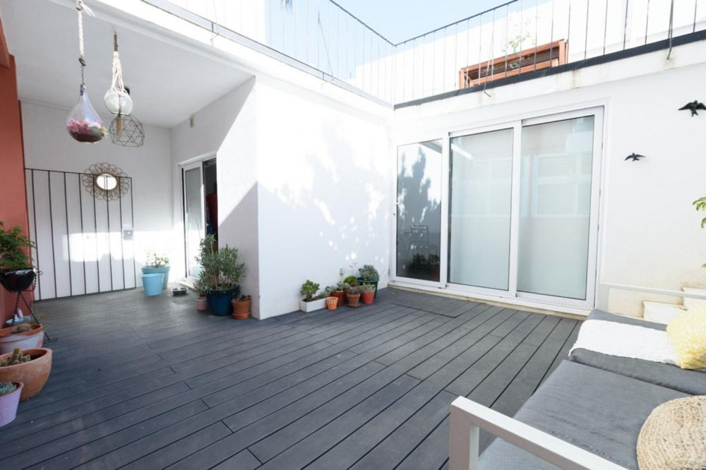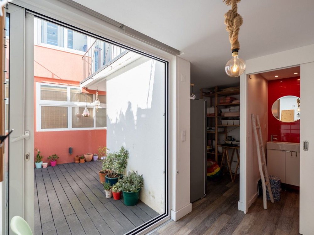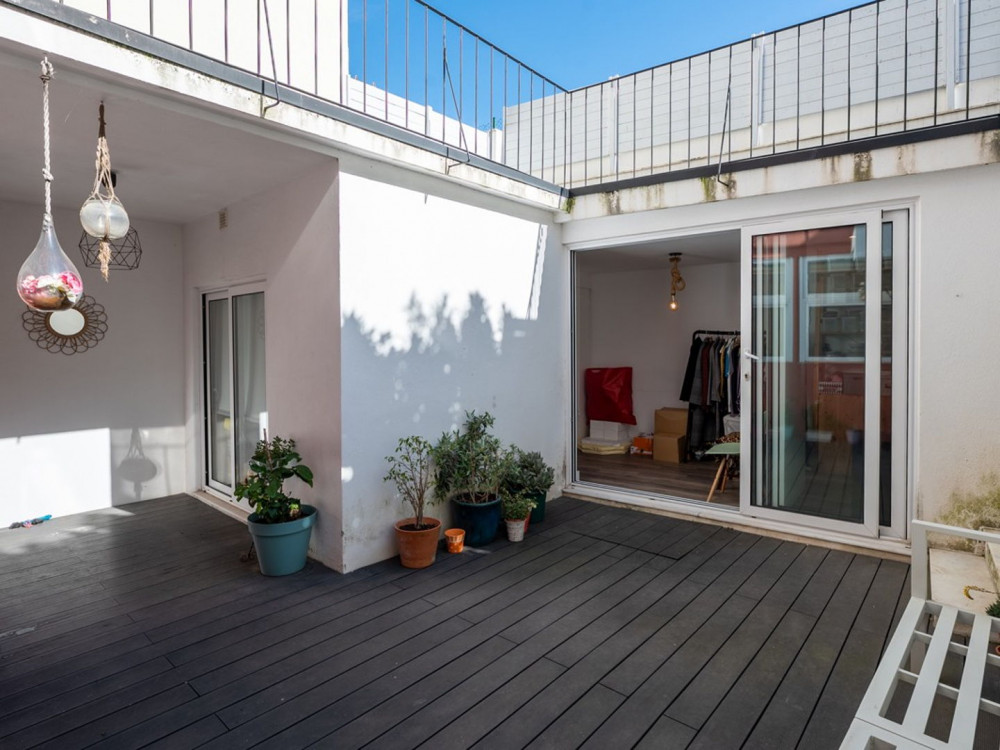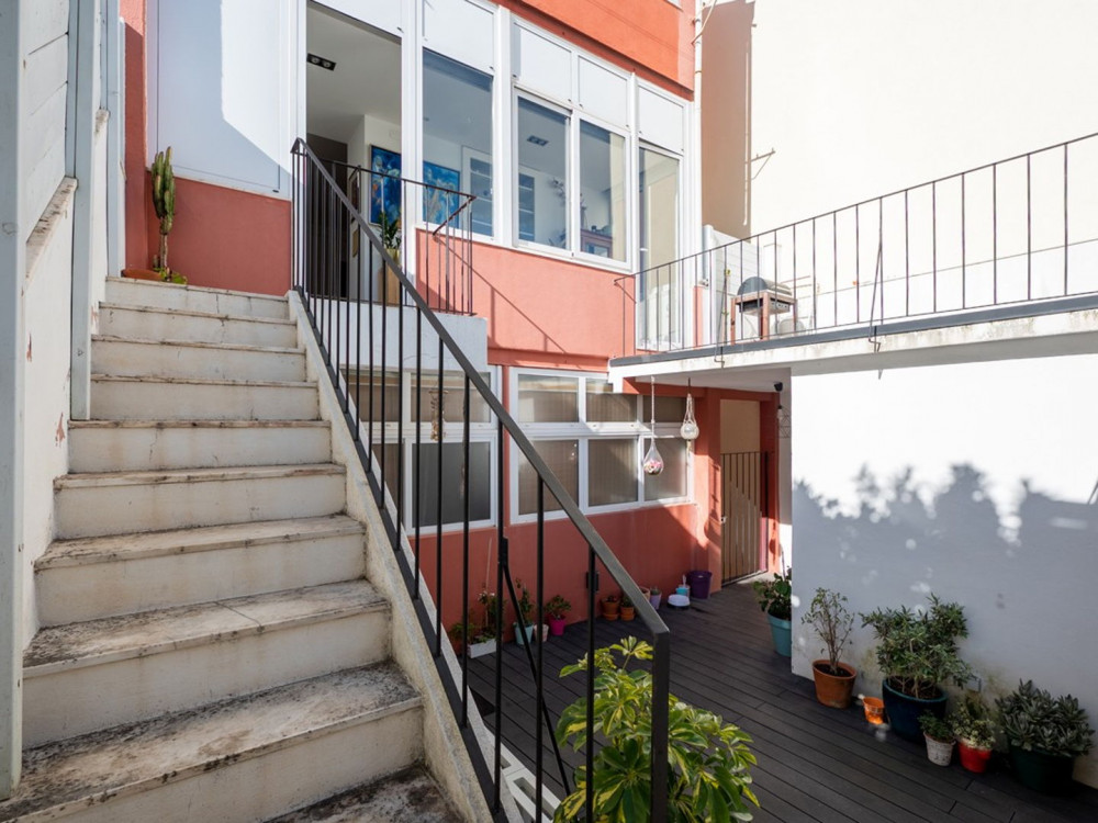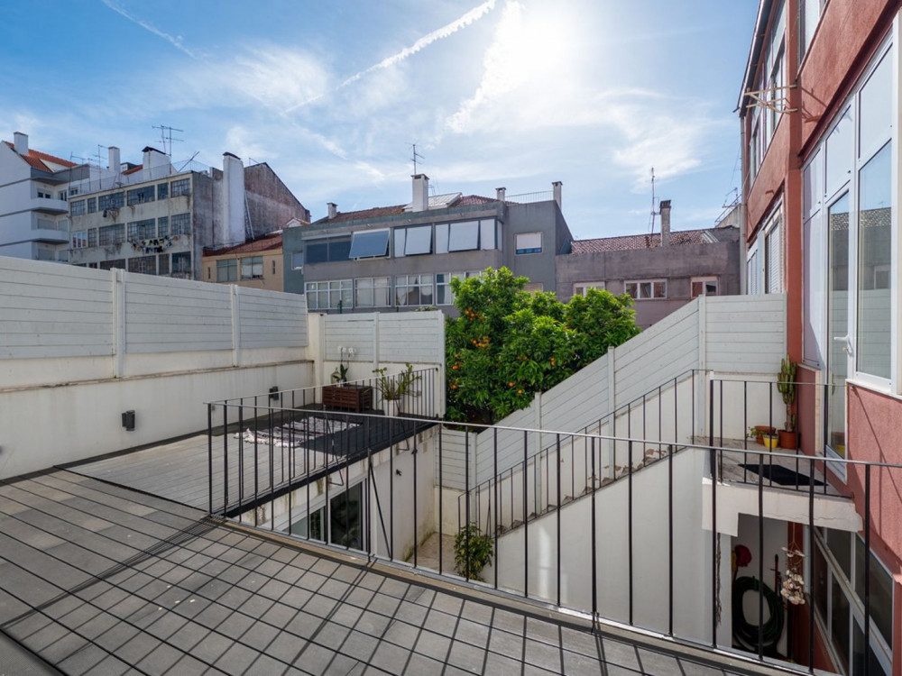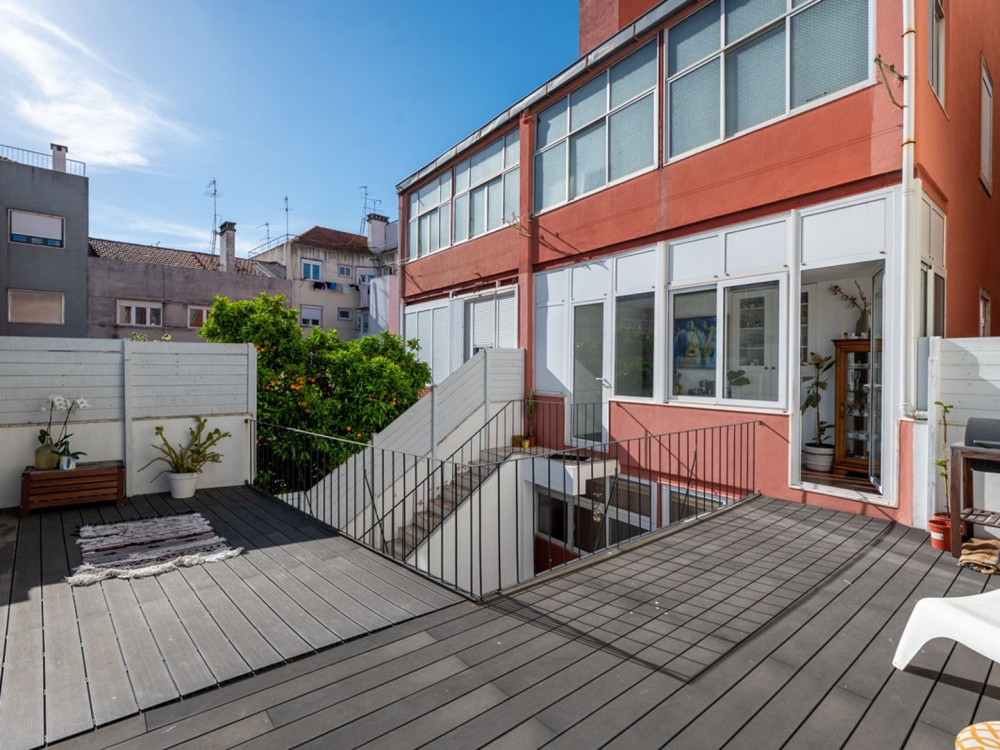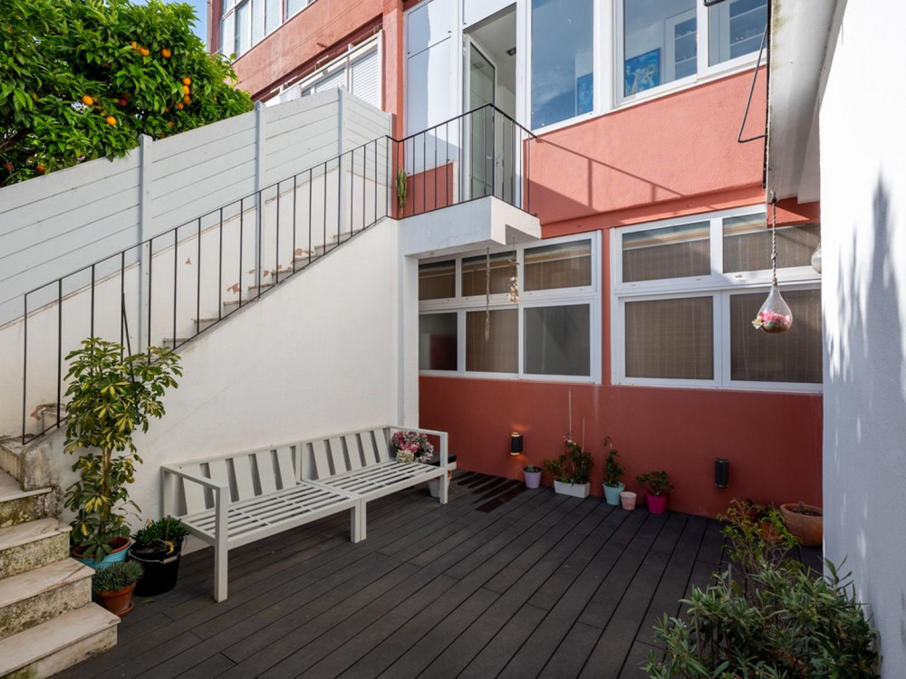 Renovated T2 in Campolide, where neighborhood life intersects with modern comfort. The house revolves around a generous deck terrace—a sunny retreat for meals—sitting atop the roof of an annex on the second terrace of the lower floor. This annex is not part of the gross private area, but offers a perfect place for an office, studio, or even to host visitors, expanding daily possibilities.