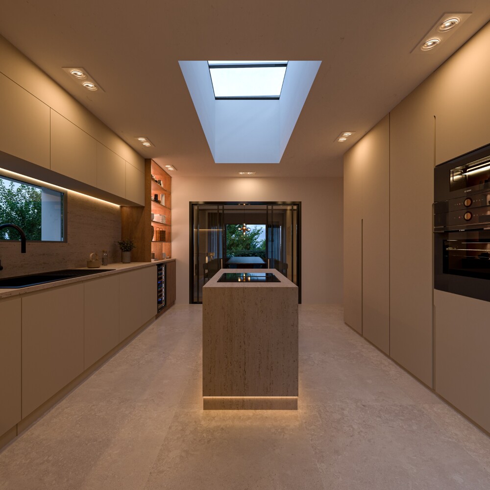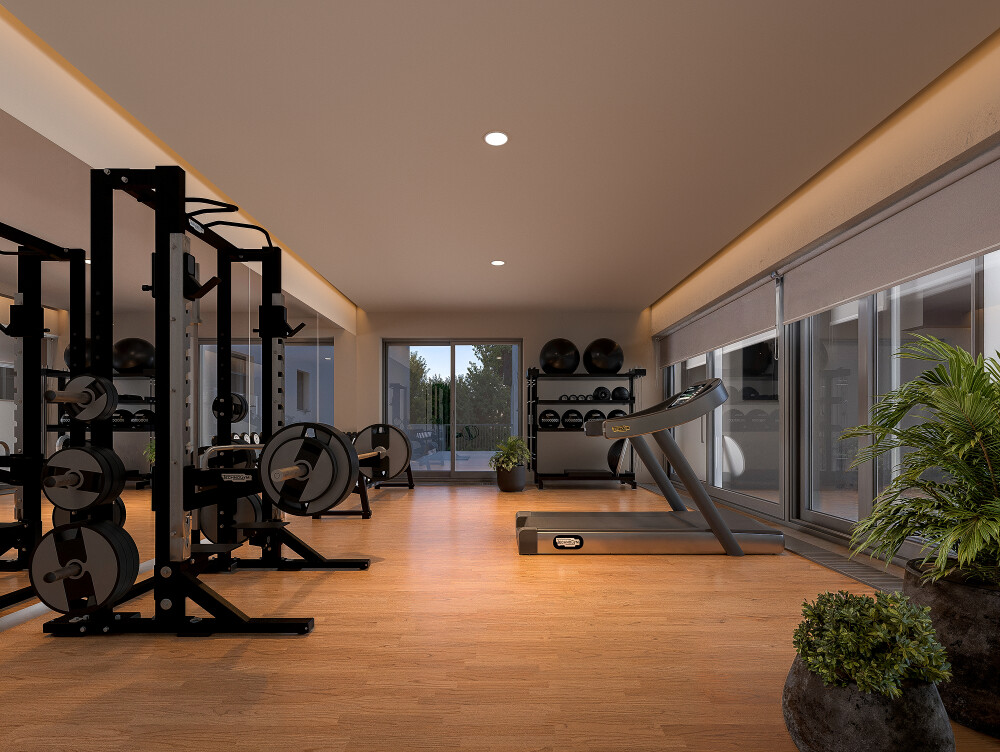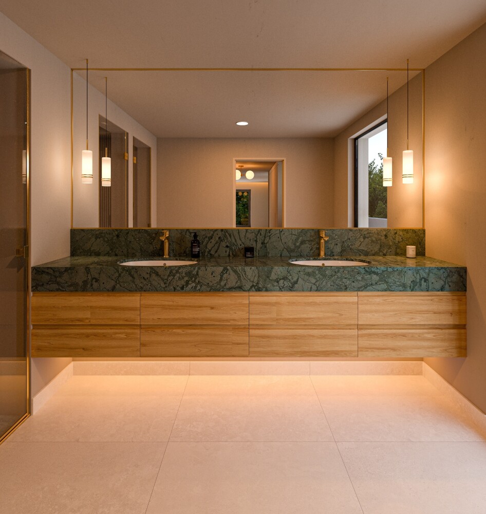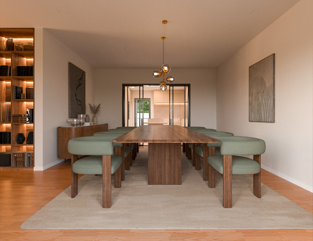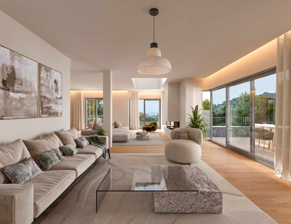 The exterior terraces, adjacent to the living areas, establish a natural connection to the outdoors and to the infinity pool, with a support bathroom, and a 68 sqm multipurpose room that promotes continuity between the different environments.