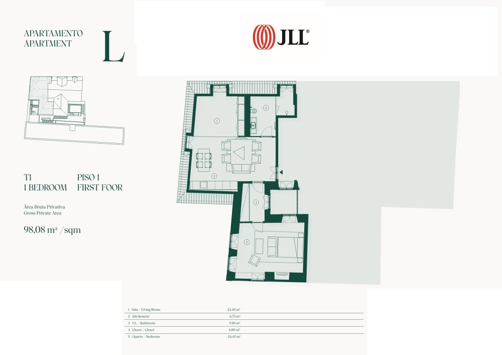 1-bedroom apartment with 98 m2 of private gross area, set in the new development located in one of the noblest areas of the city, in Belém, Lisbon.