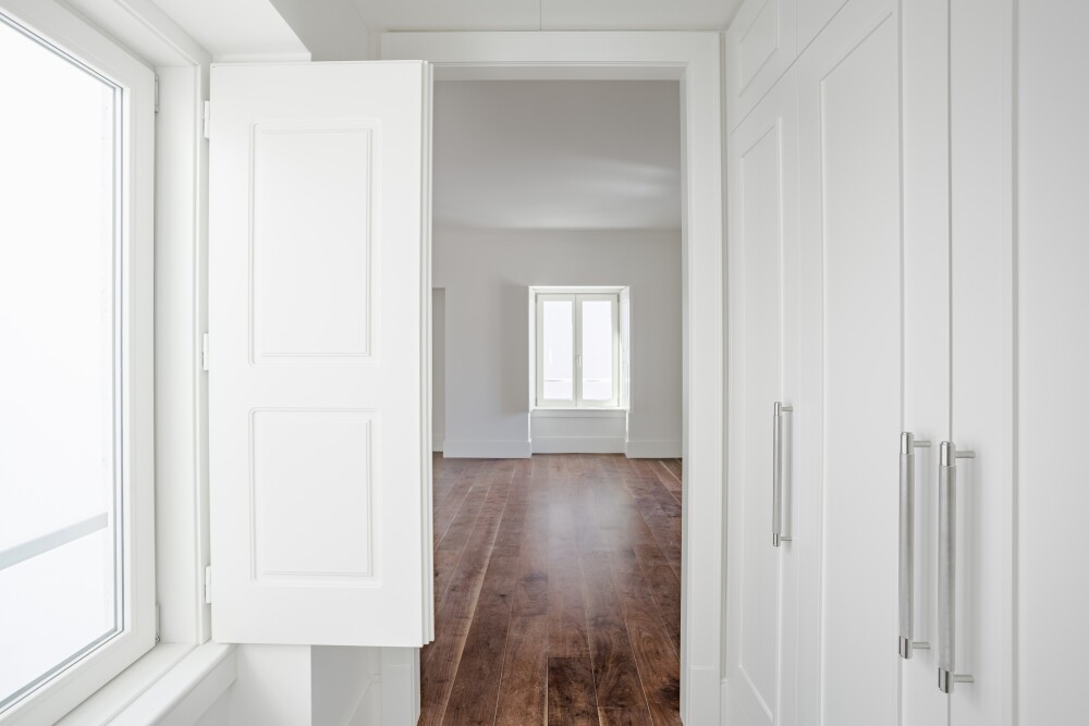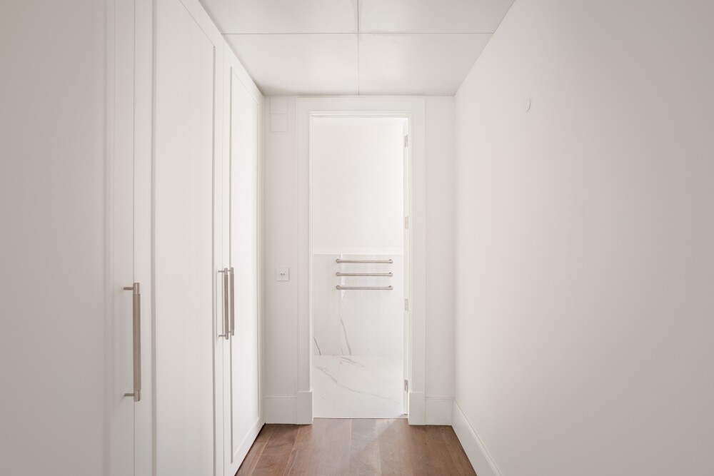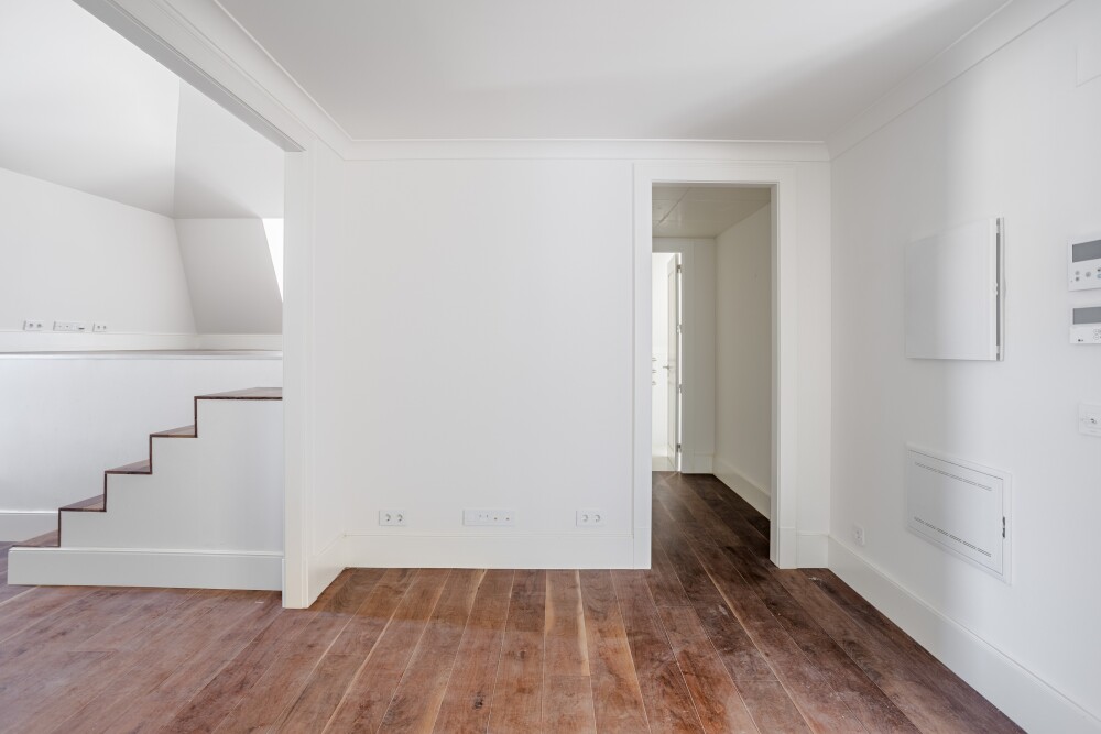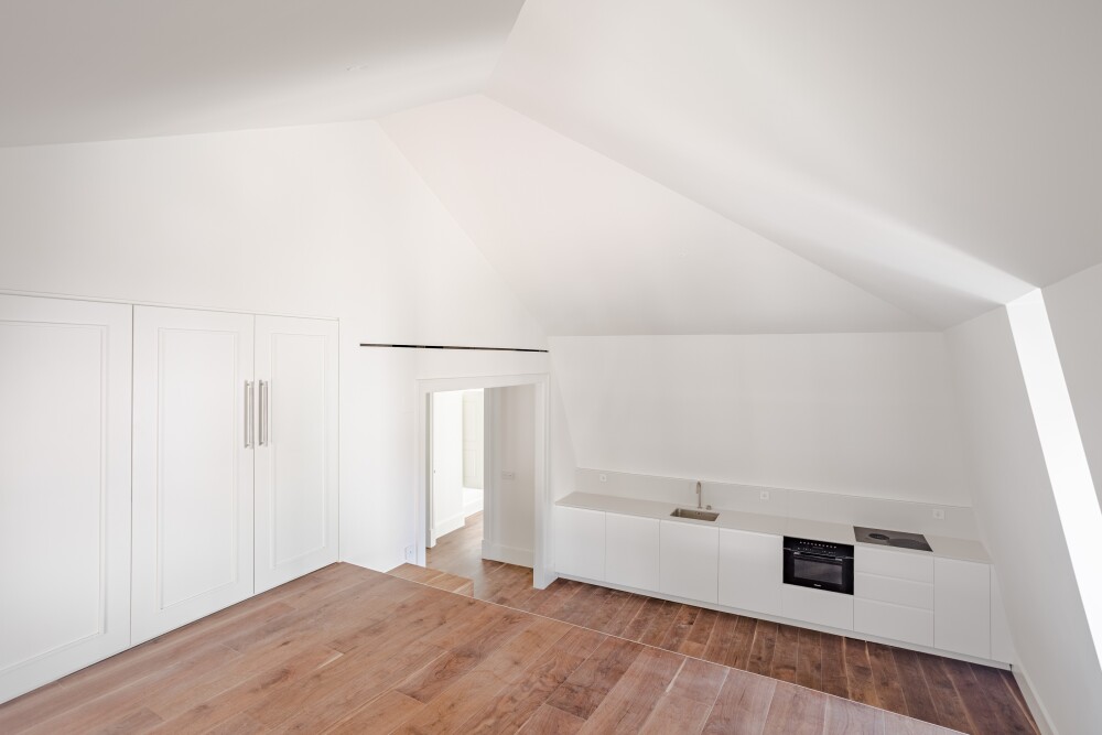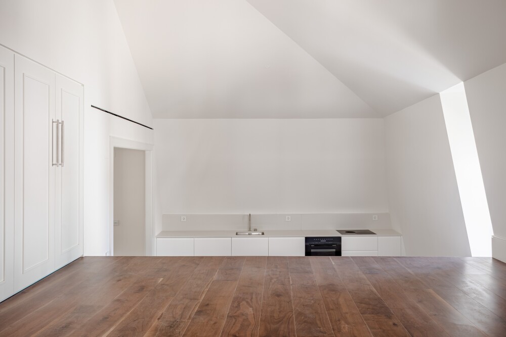 The apartment, which is located in the rehabilitated building, consists of a living room with dining area and open and equipped kitchen in a total area of 31 m2 and a bedroom completely independent from the social area, with a closet antechamber, receiving natural light through 6 openings with different sun exposures.