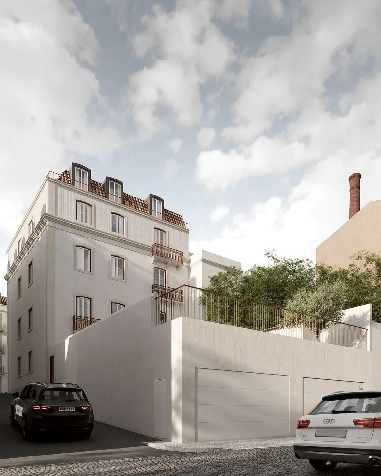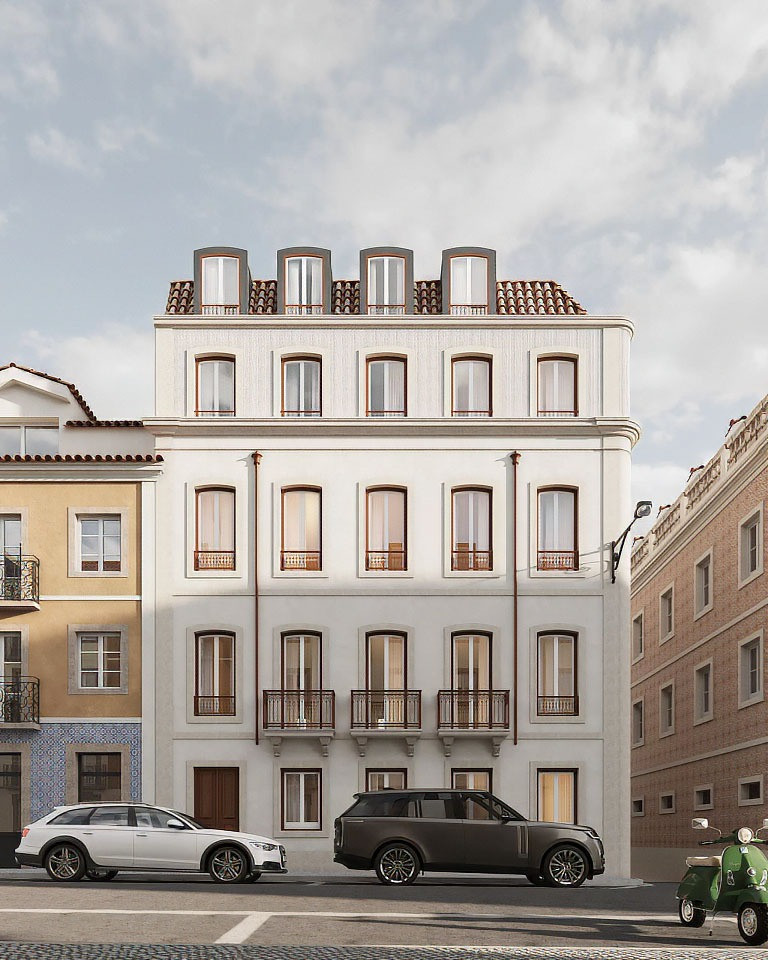 The building also features aluminium window frames with thermal break, Multi-Split air conditioning system, heat pump, video intercom, lift, fire doors, extractors, fire detection system, lioz limestone access points, oak staircases, electric vehicle charging points, and a sectional gate at the car park. The façades benefit from both internal and external thermal insulation, a waterproofed roof with clay-coloured tiles, and the surrounding outdoor area includes microcement pathways and the restoration of original features such as lioz limestone mouldings.