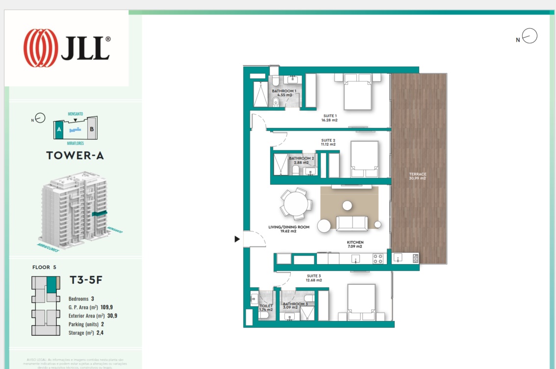 3-bedroom apartment with 110 sqm of private gross area, two parking spaces and storage room, in Monview, Miraflores, Oeiras.Consisting of a living room with an open equipped kitche…
