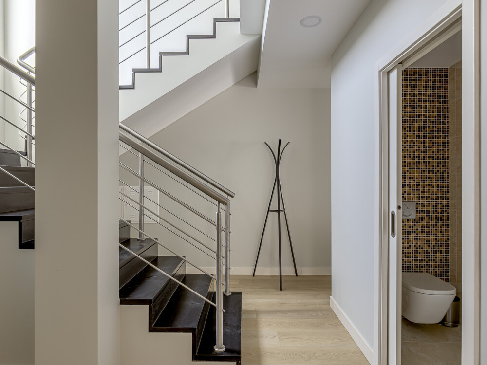 On the lower floor, there is a spacious living room with dining area and direct access to the private garden with swimming pool.