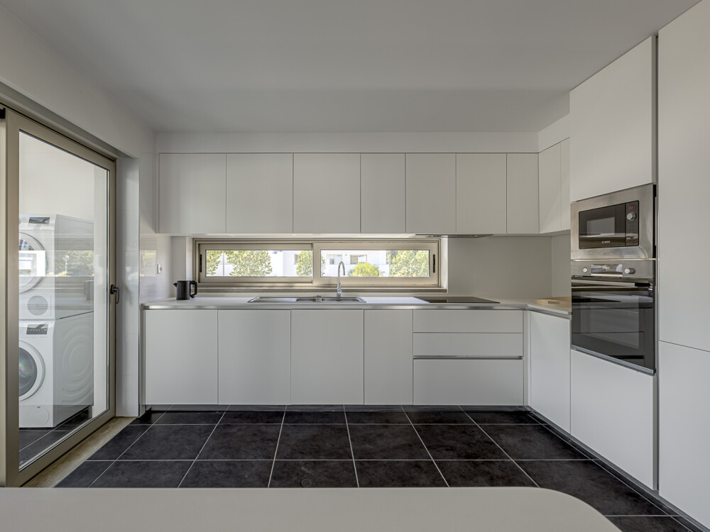 The fully equipped kitchen, featuring Bosch appliances, has access to a balcony with a laundry area.