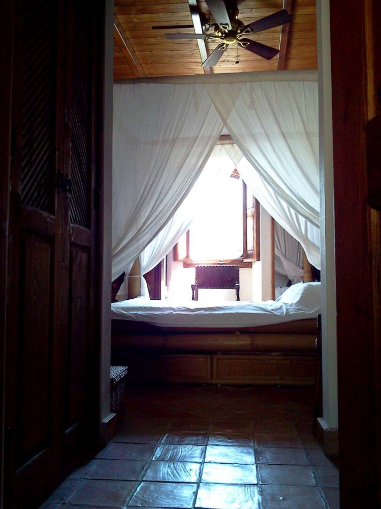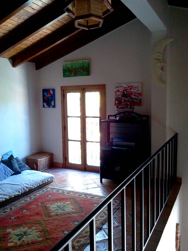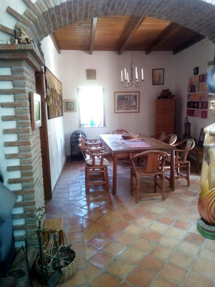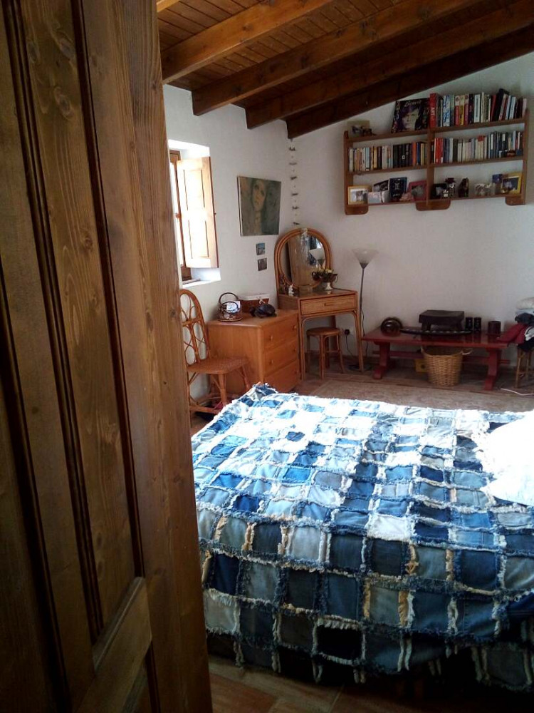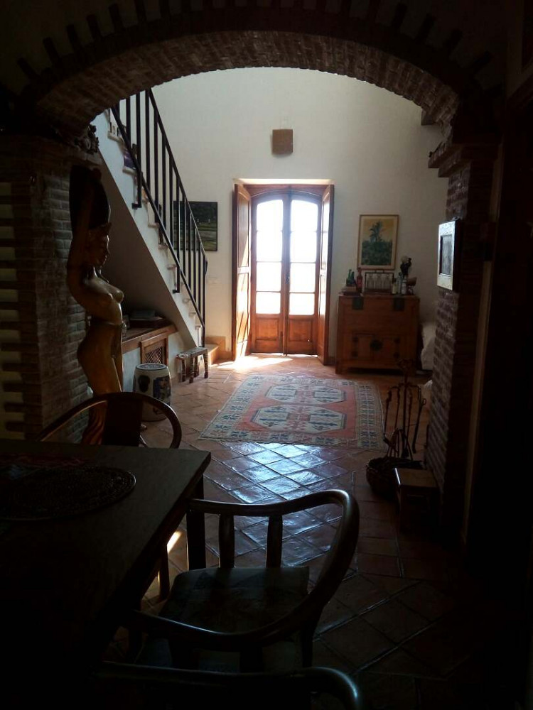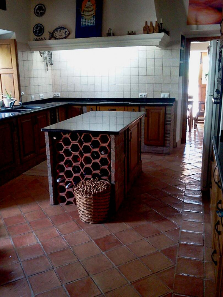 Traditional terracotta floor tiles and wood-beamed ceilings run throughout the interiors, enhancing the home’s rustic charm.