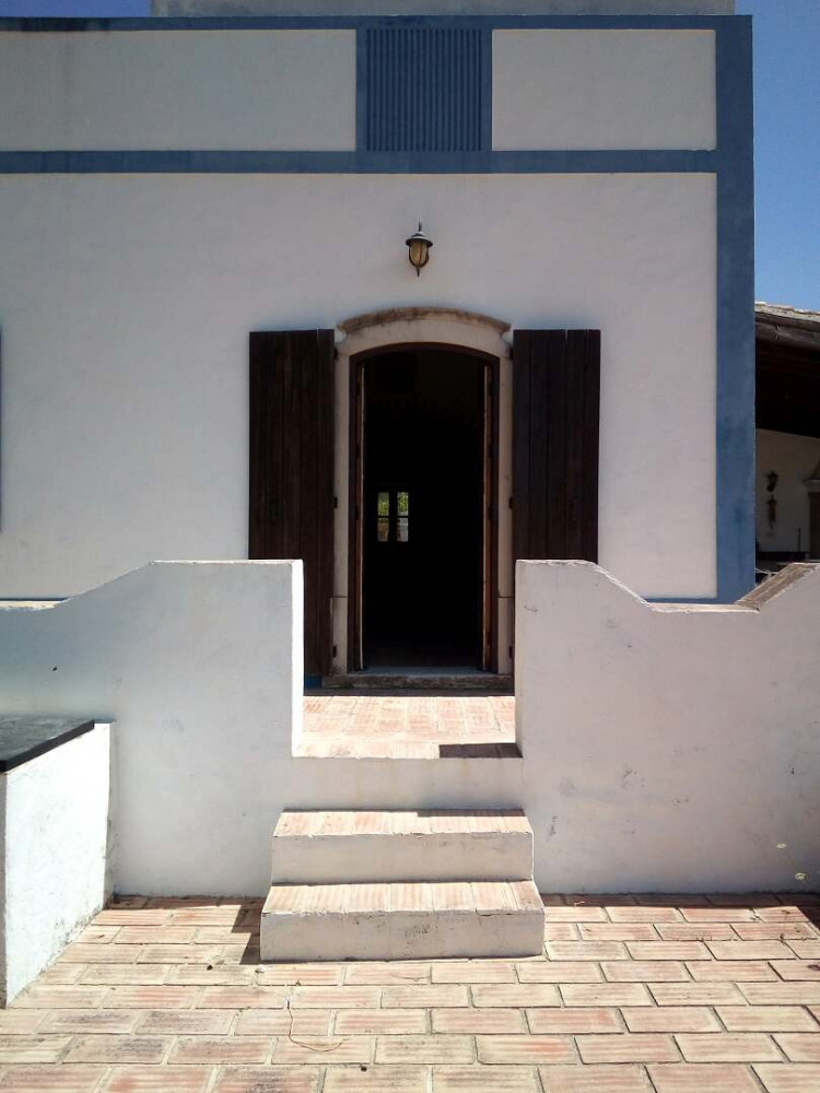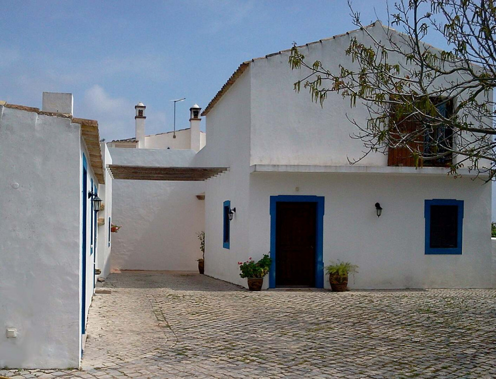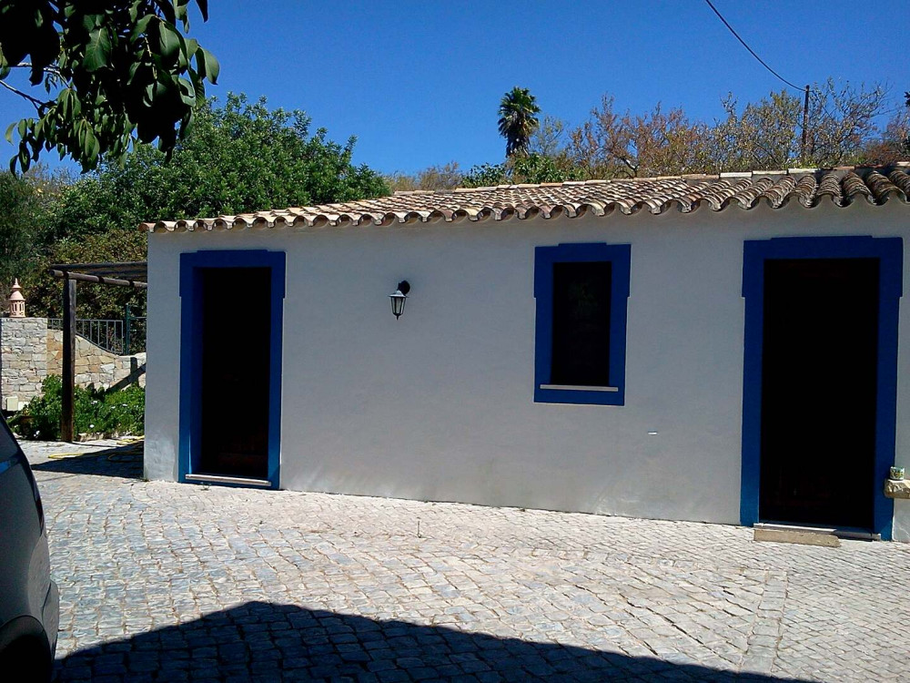 The exterior features traditional dry stone walls, a calçada (cobblestone) driveway, ladrilha patios, and whitewashed walls accented with Algarve blue trim. Original window and door surrounds remain intact, complemented by wood-framed windows and interior/exterior shutters.