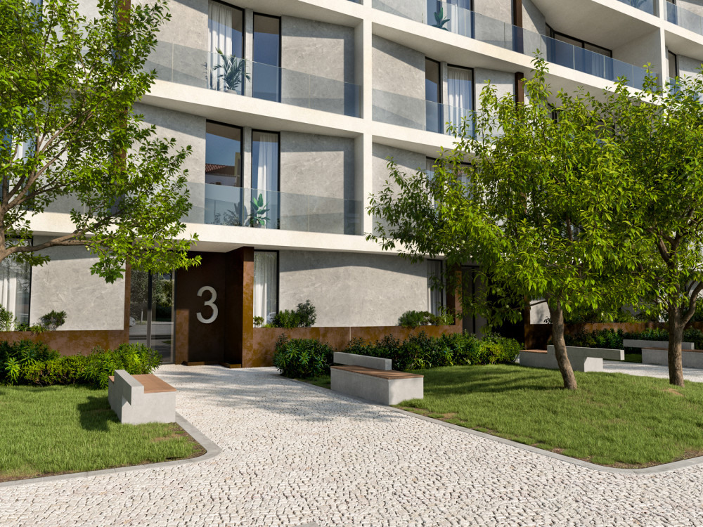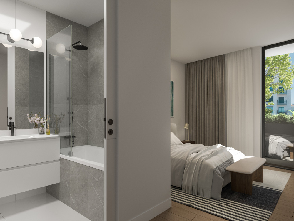 The property, located on floor 0 at the level of floor 1, has a social area of 31.66 m², integrating living room and kitchen in open space, with direct connection to the private terrace. This 18 m² outdoor space allows the creation of an outdoor dining area or leisure area, expanding the interior environment and promoting greater natural light. The kitchen, organised in a linear way, has an efficient technical area and direct access to the independent laundry, optimising the functionality of the space.