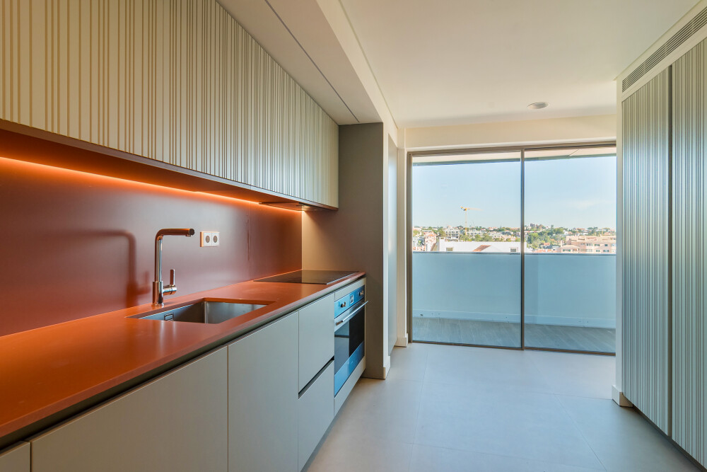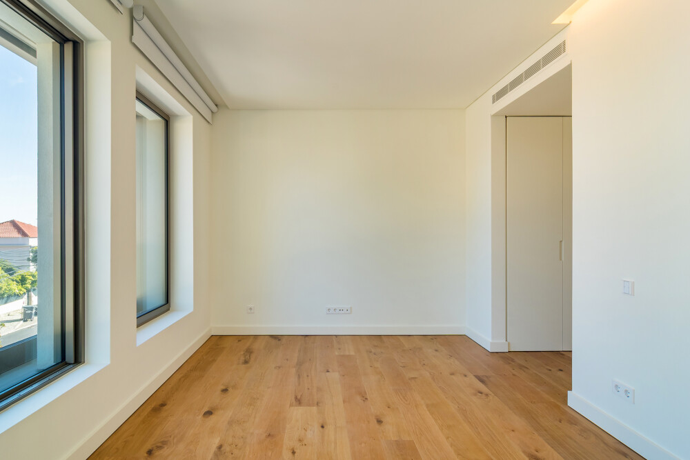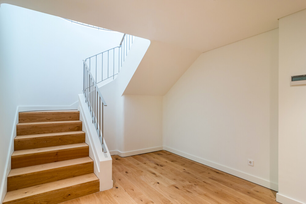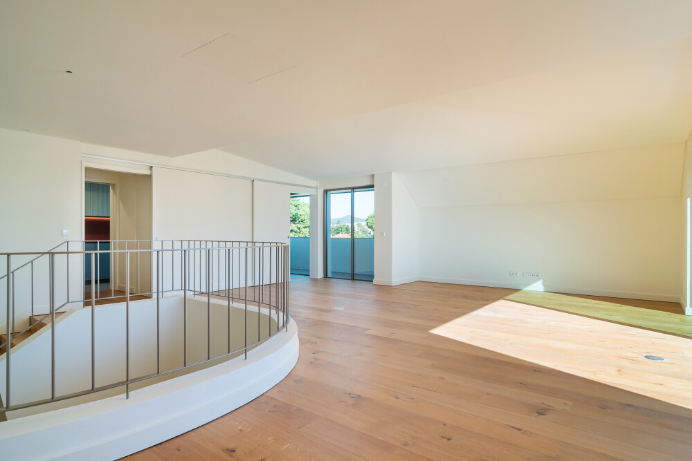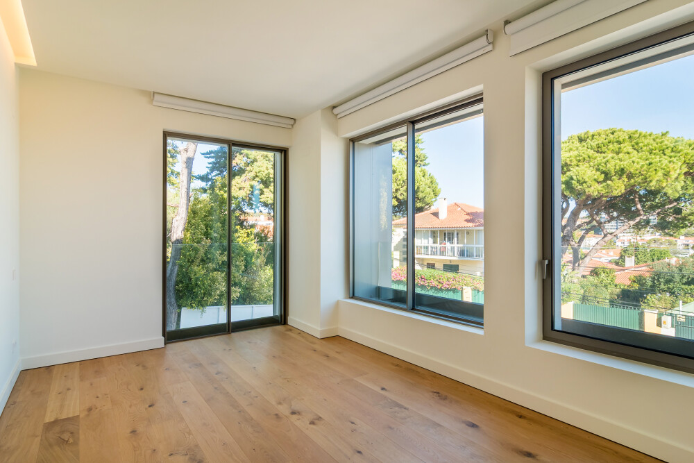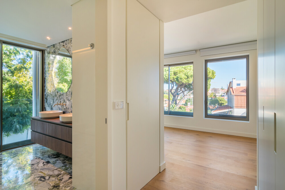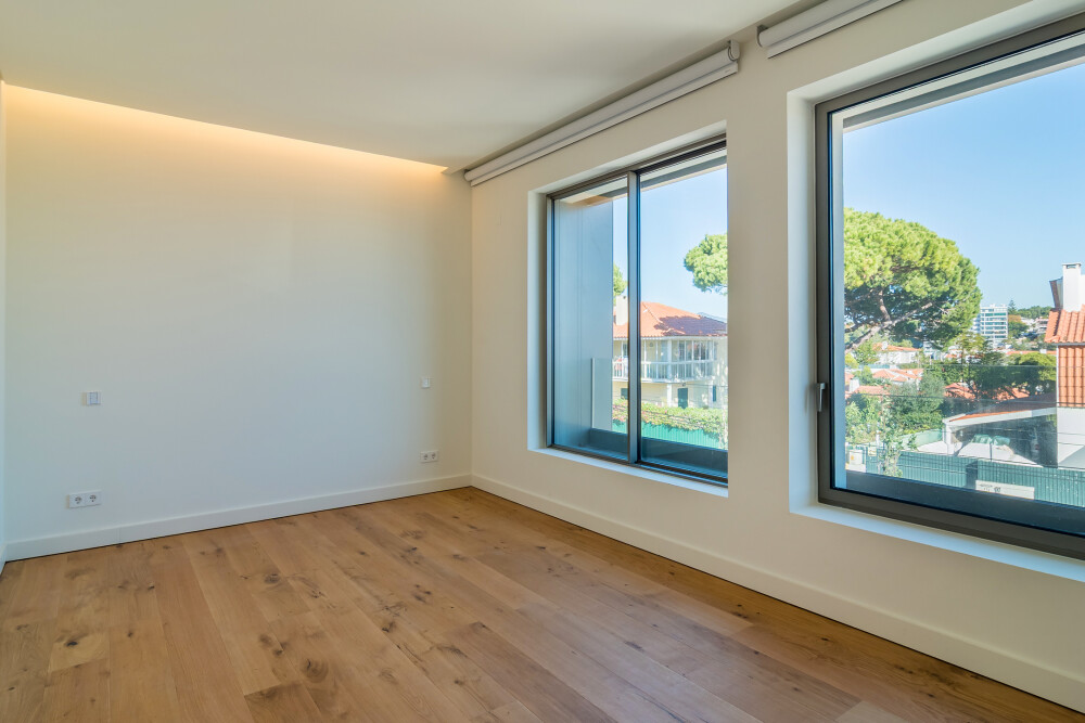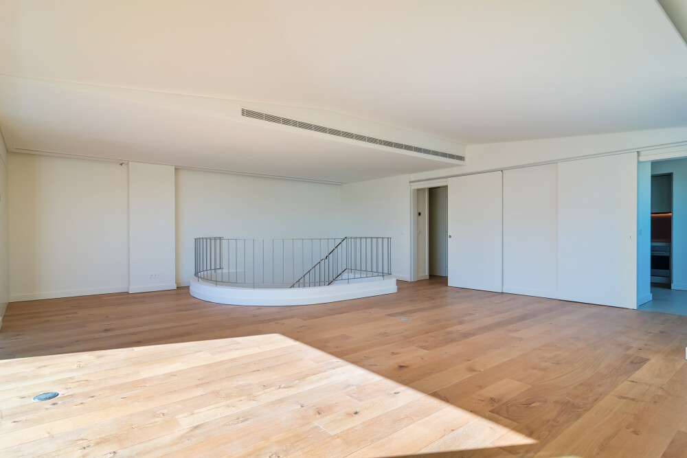 On the upper floor, the apartment features a spacious living room facing east and south, with direct access to two balconies overlooking Cascais and the sea.