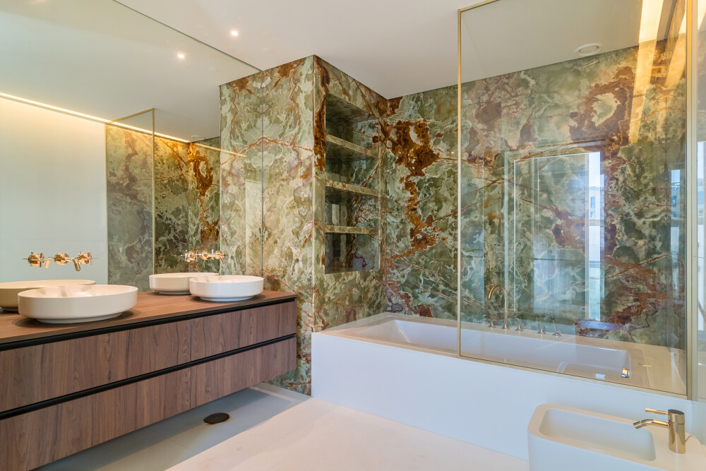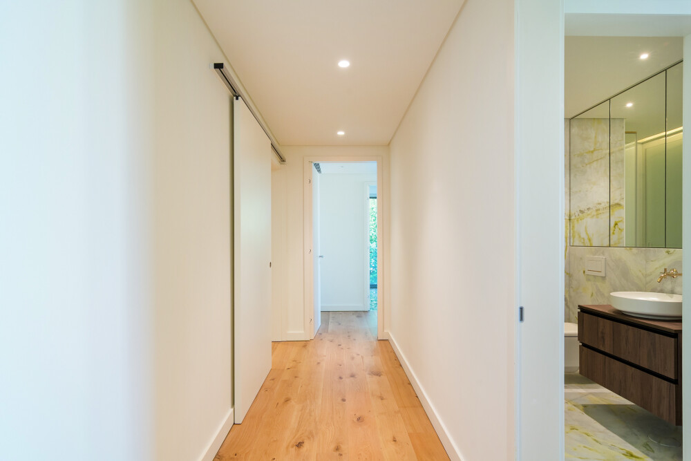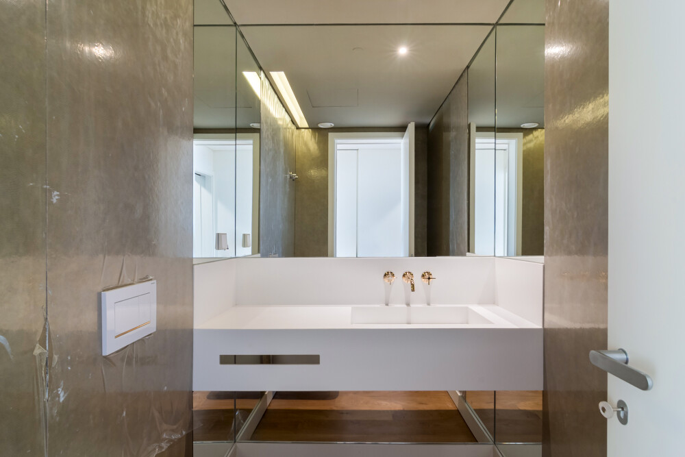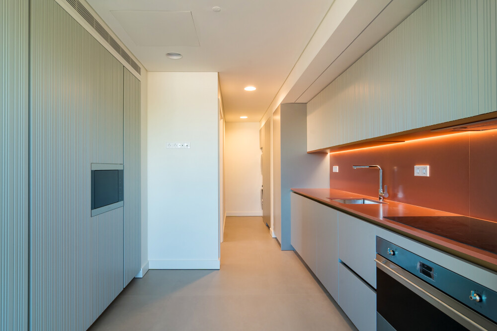 Designed by the architectural studio RRA Projects, the apartment features kitchens equipped with SMEG appliances, bathrooms finished in natural stone and Corian, textured walls, wall‑hung sanitary ware, Dornbracht taps, Foursteel heated towel rails and underfloor heating.