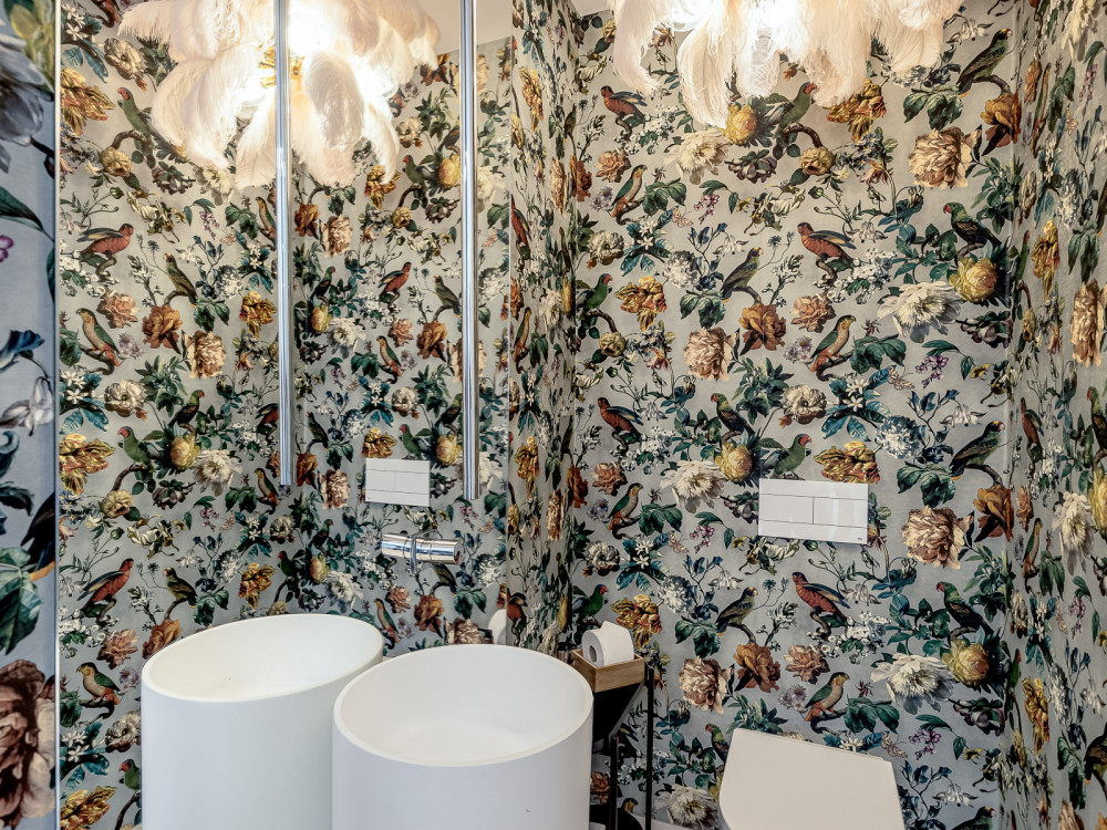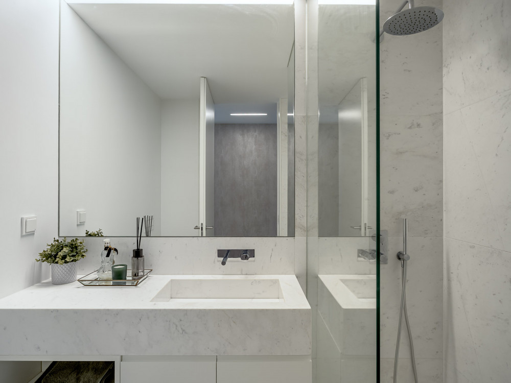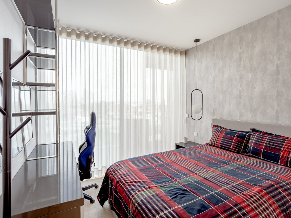 On the lower floor, there is a welcoming entrance hall, a guest bathroom, a large living room of about 50 m² and direct access to a spacious balcony, providing natural light and open views. The dining room integrates harmoniously with the equipped kitchen, ideal for socialising and family meals, with direct connection to a second balcony. Also on this floor, there is a suite with a private balcony and an independent laundry, offering greater functionality to everyday life.