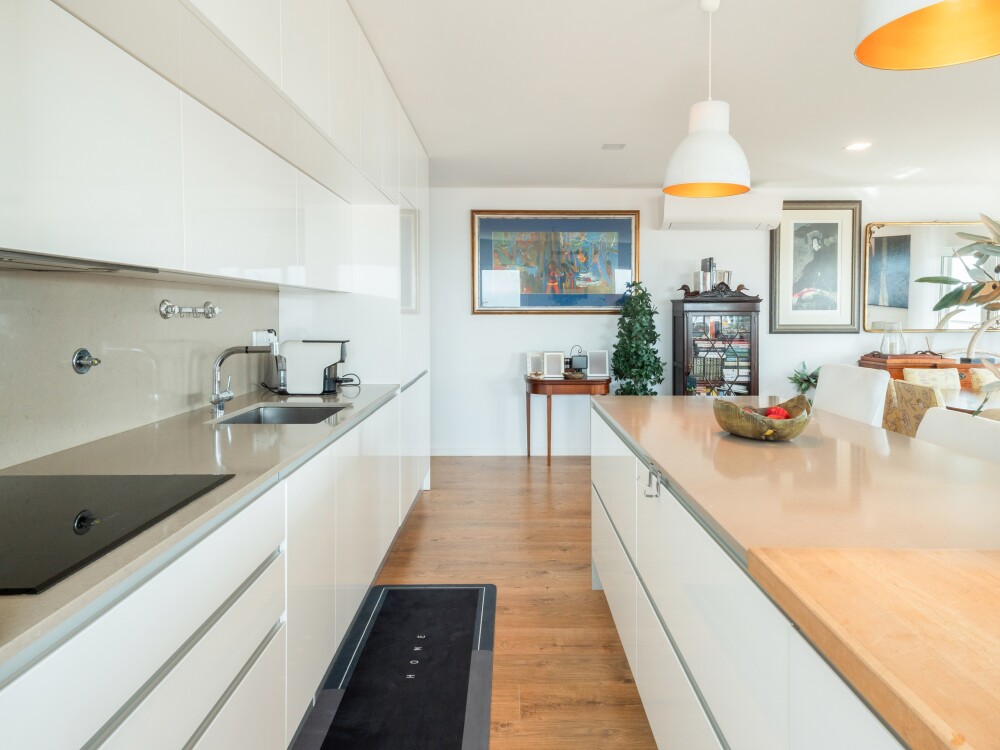 The kitchen includes a central island with a dining area and provides direct access to the terrace with sea view.