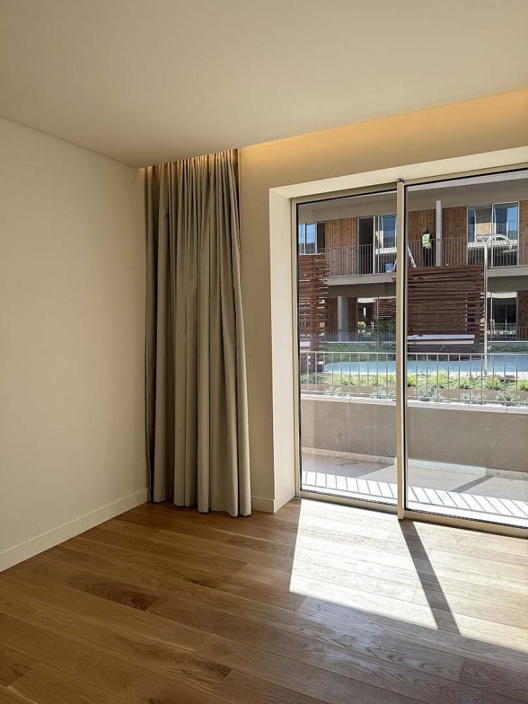 The apartment consists of a spacious living room, a comfortable bedroom with built-in wardrobes, a contemporary bathroom, and a private terrace. Although located on the ground floor, the property benefits from a very pleasant outlook over the pool and landscaped gardens, as well as a lateral view of the sea, which makes it feel open and connected to the surroundings.