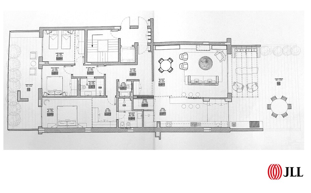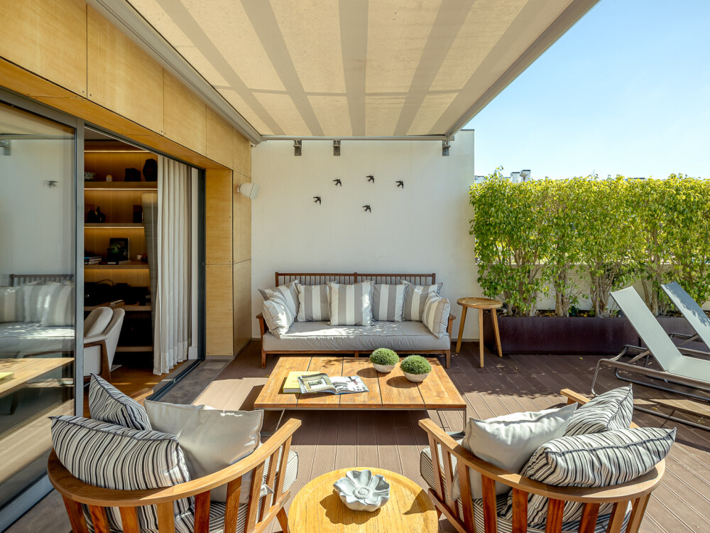 It also includes three bedrooms, all with built‑in wardrobes and access to the terrace, one of which is a master suite with walk‑in closet, as well as a bathroom serving the remaining bedrooms.