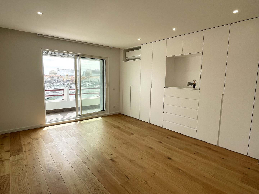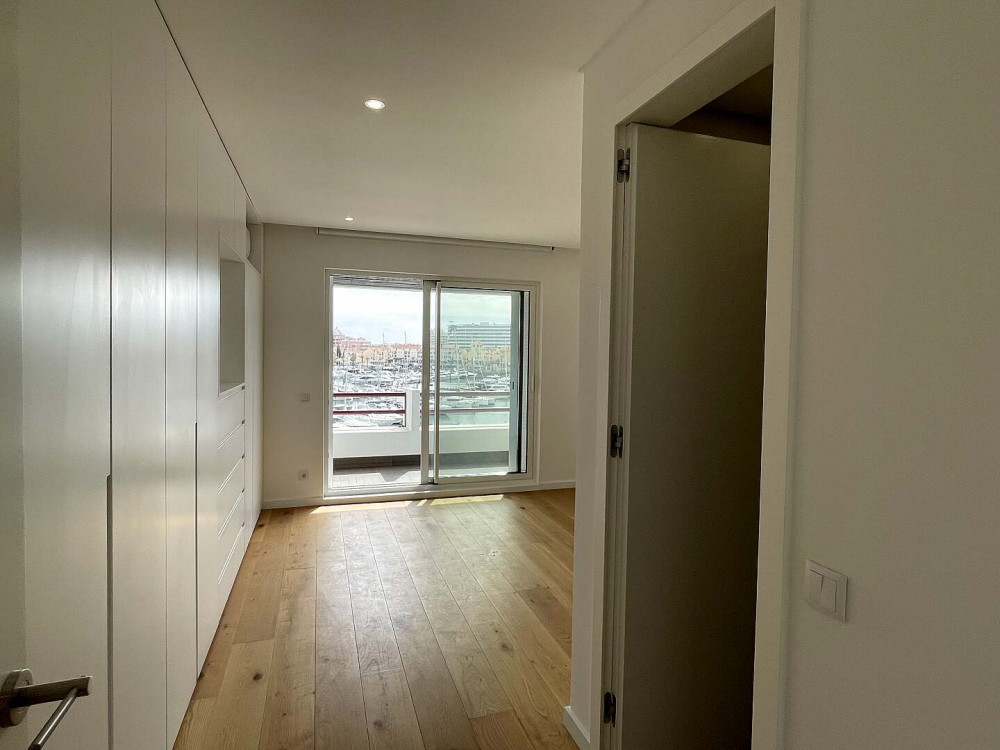 The living space is open and deliberately simplified, designed to frame the marina itself as the focal point. Floor-to-ceiling glazing draws in natural light and anchors the apartment to its waterfront setting, while the kitchen has been fully integrated with modern appliances and custom cabinetry, balancing form with function.