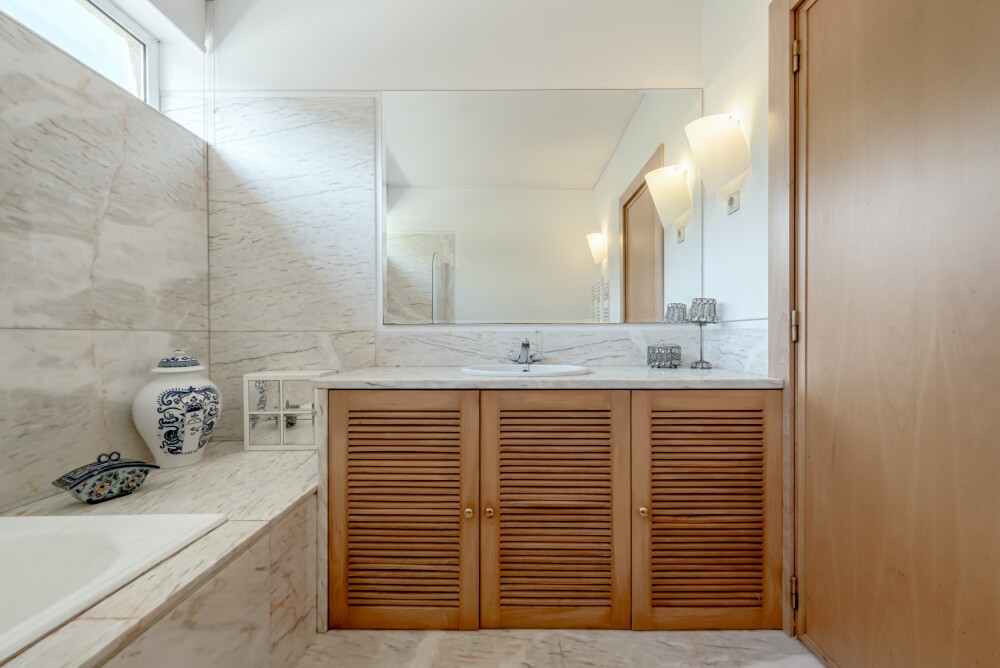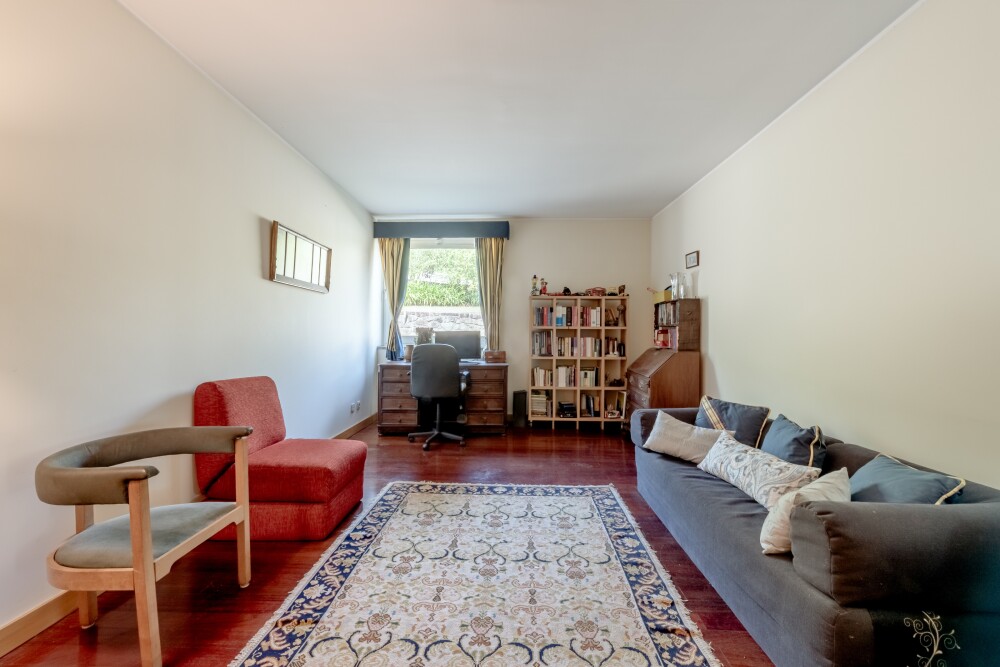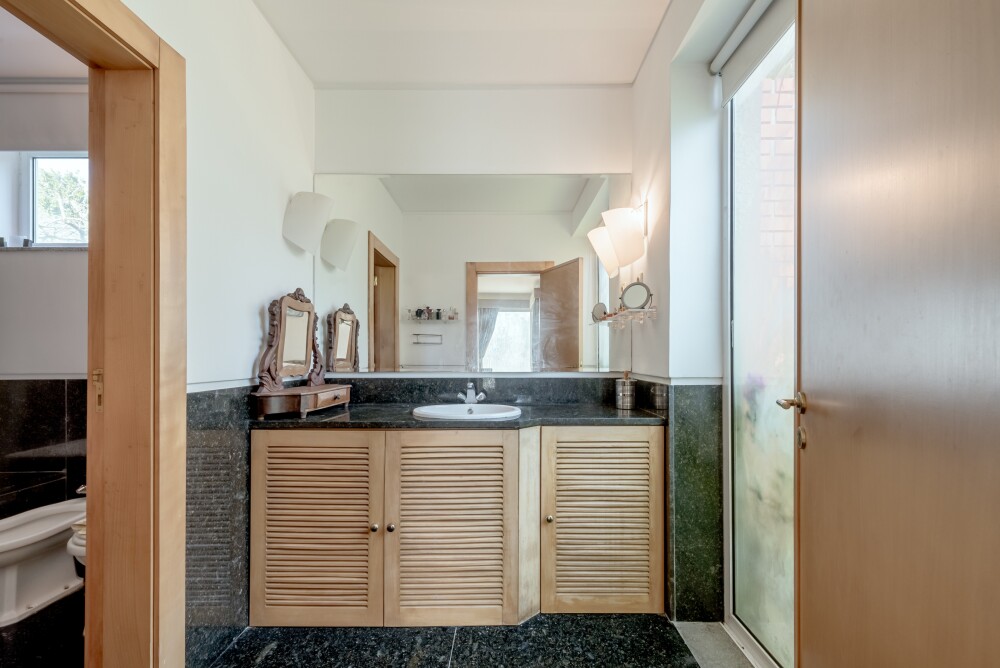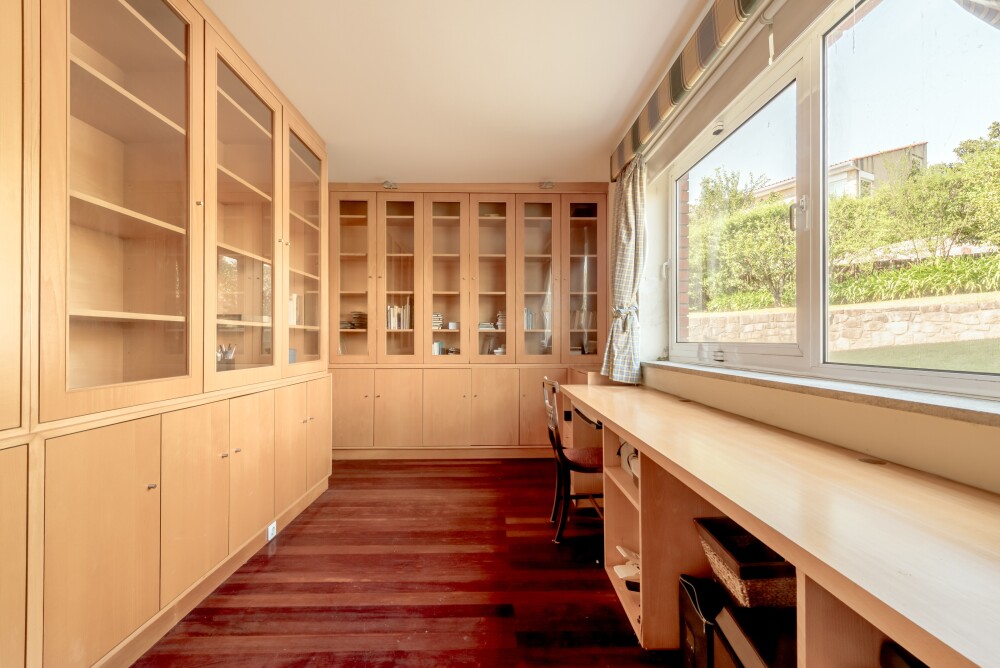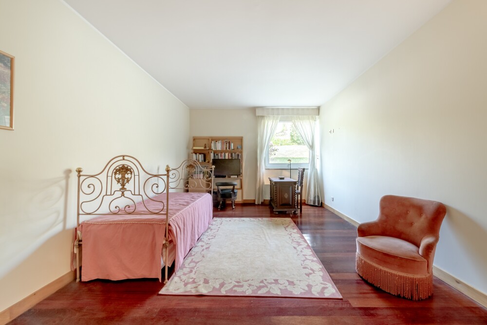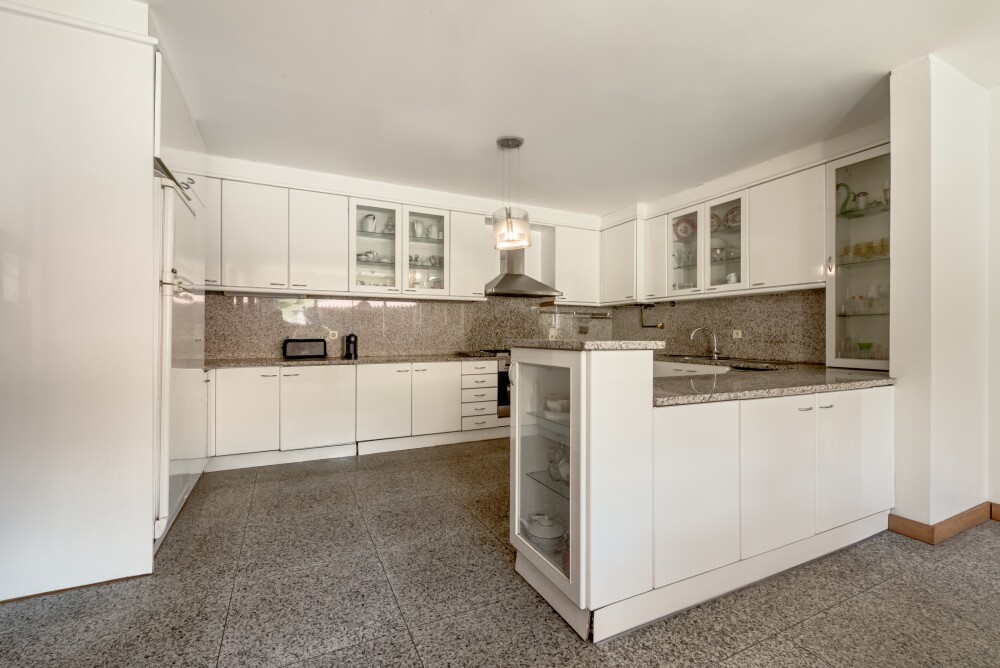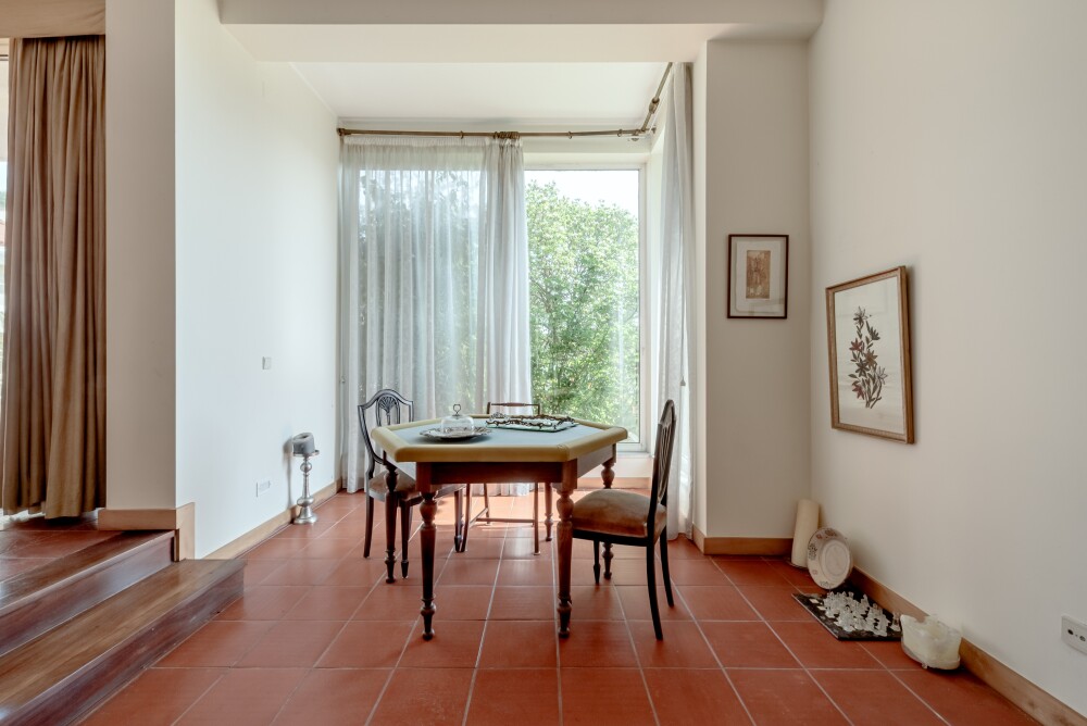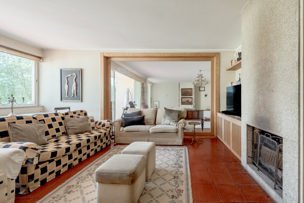 The villa comprises a 56 m² living room with direct access to the 83 m² terrace and garden, a 32 m² dining room with access to a balcony, as well as an additional 25 m² living room with fireplace.