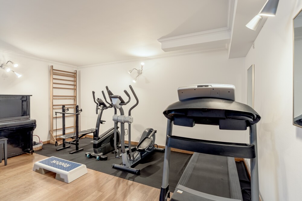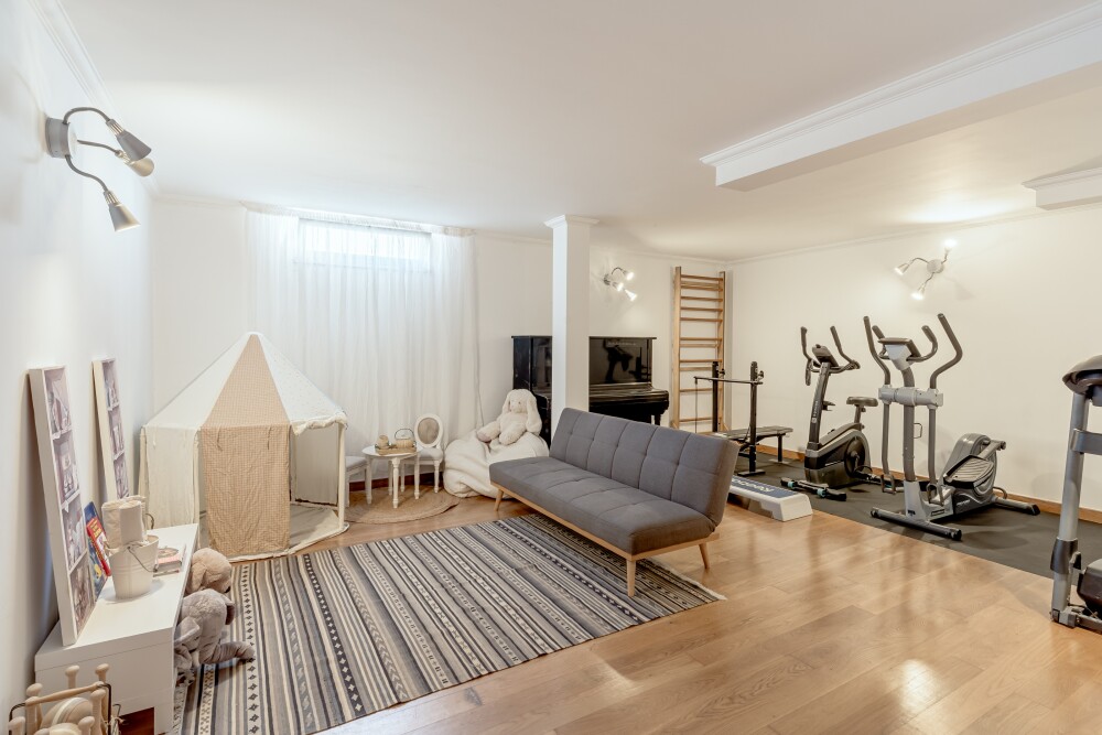 The lower floor offers a garage for two cars and a 32 sqm multi-purpose room, currently used as a gym and playroom.